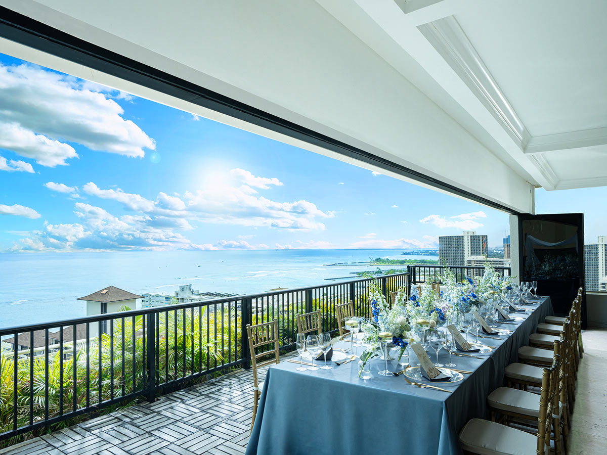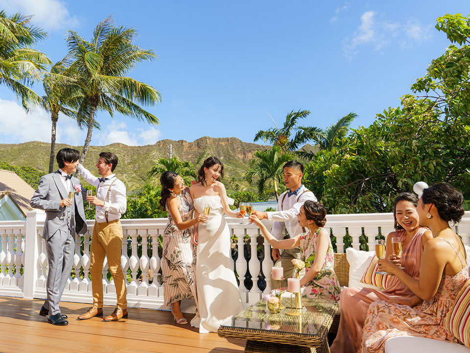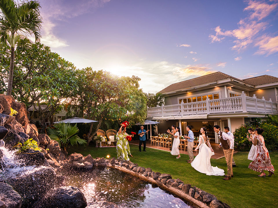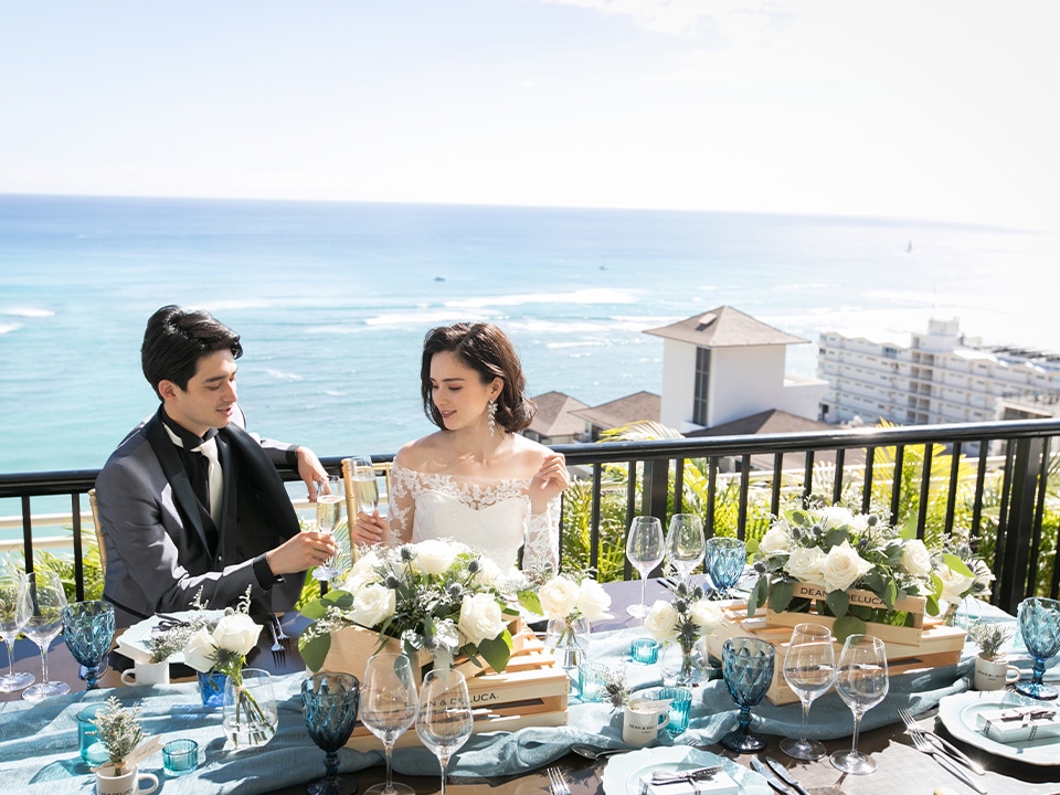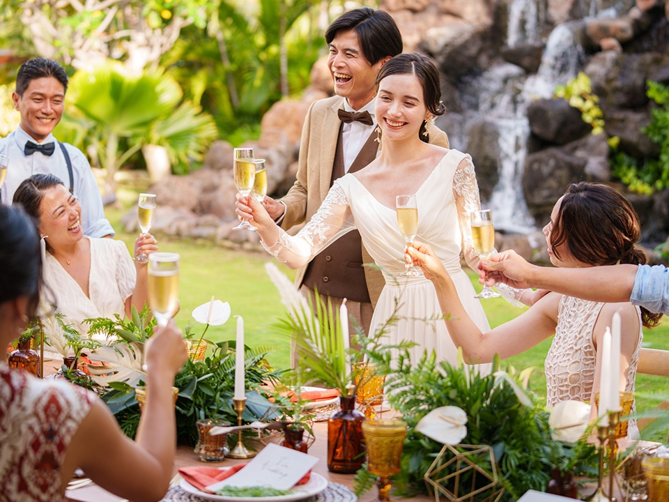 大聖堂での挙式後は青い海と空に包まれて ハワイらしいパーティーを。
