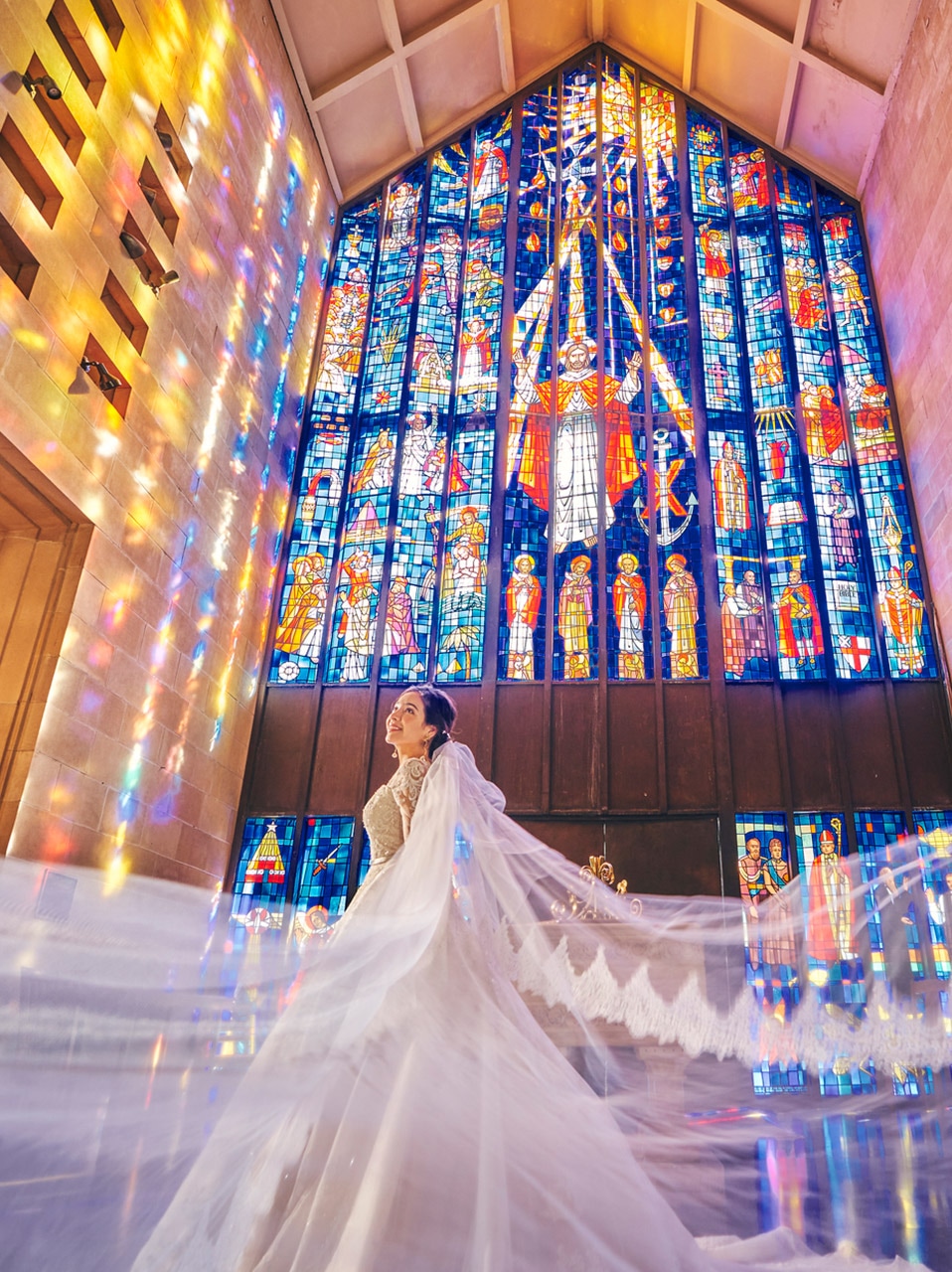ステンドグラスの光を背にうけながら、祭壇まで続く47mもの長いバージンロードをゆっくりとおすすみください。