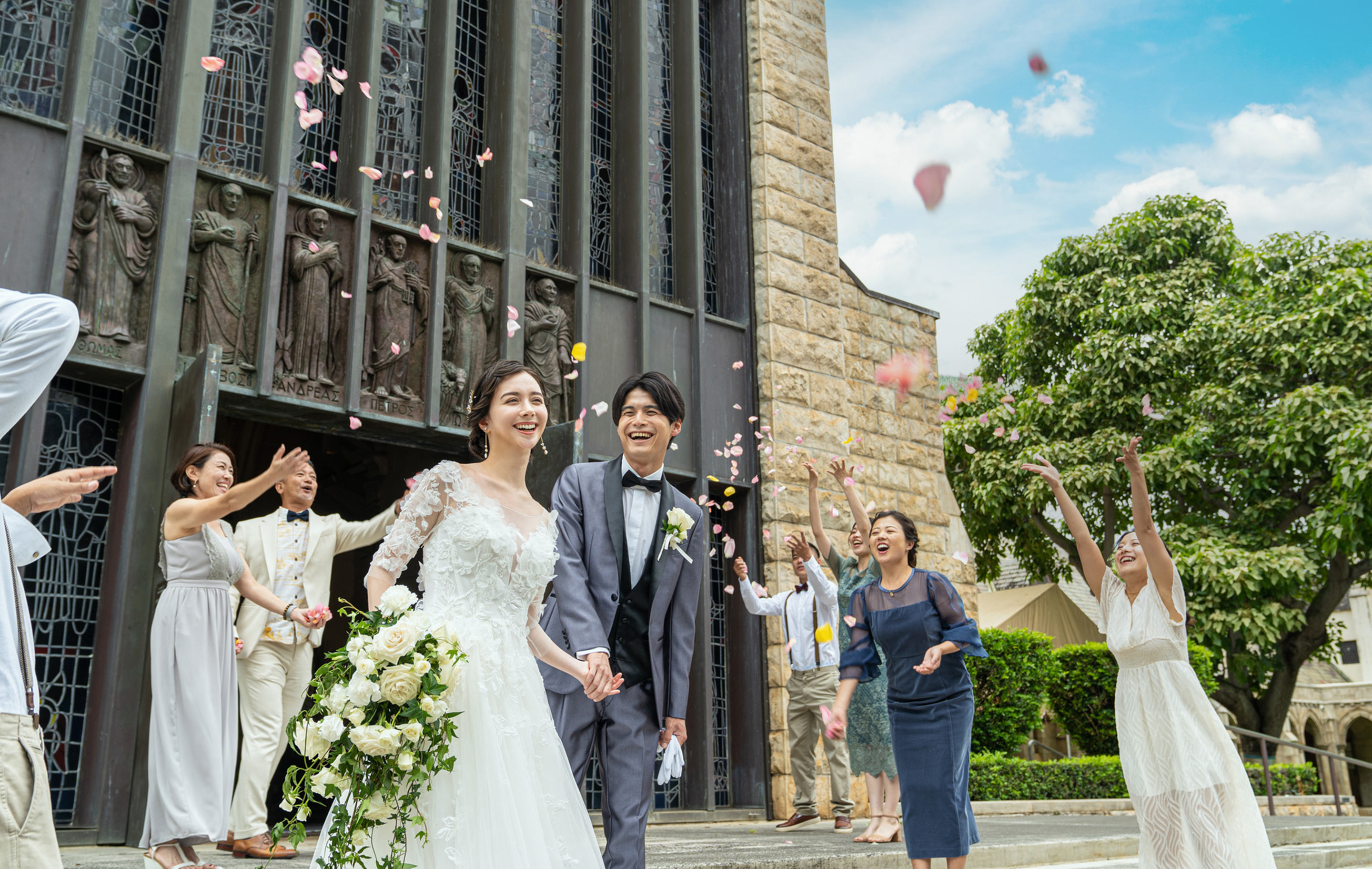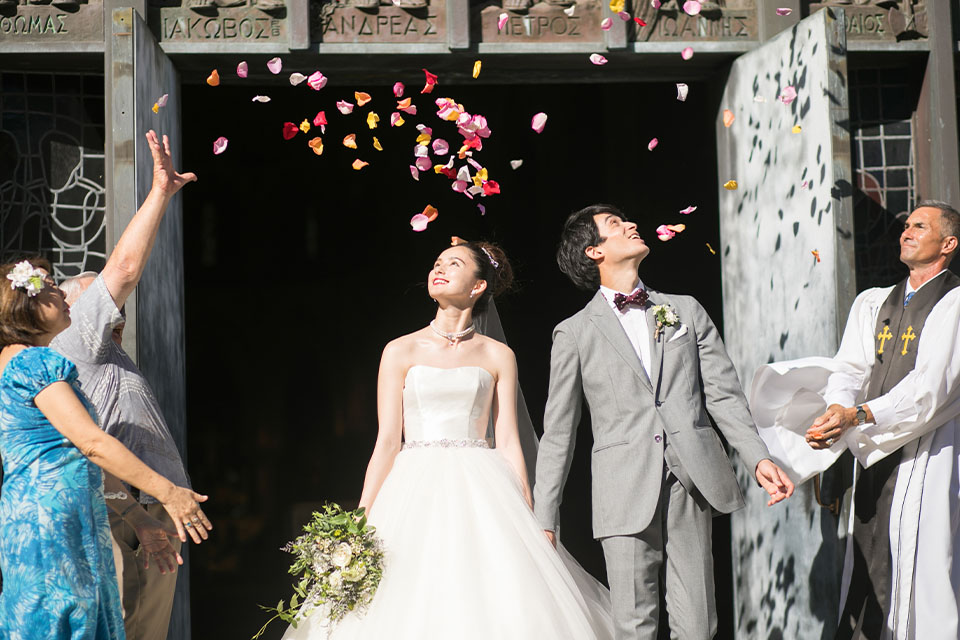 挙式後、ゲストからおふたりへ祝福のフラワーシャワーを。花の香りでまわりを清め、幸せをねたむ悪魔からおふたりを守るという意味が込められています。