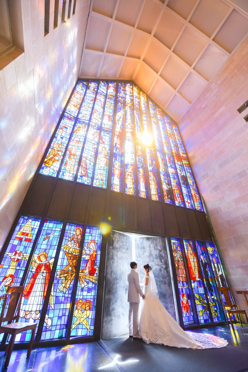 太陽光がステンドグラスに差し込み、カラフルな光が教会入口に映ります。