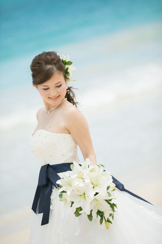 海&空の色に合わせて、ドレスにはネイビーのリボンをお選びいただきました。