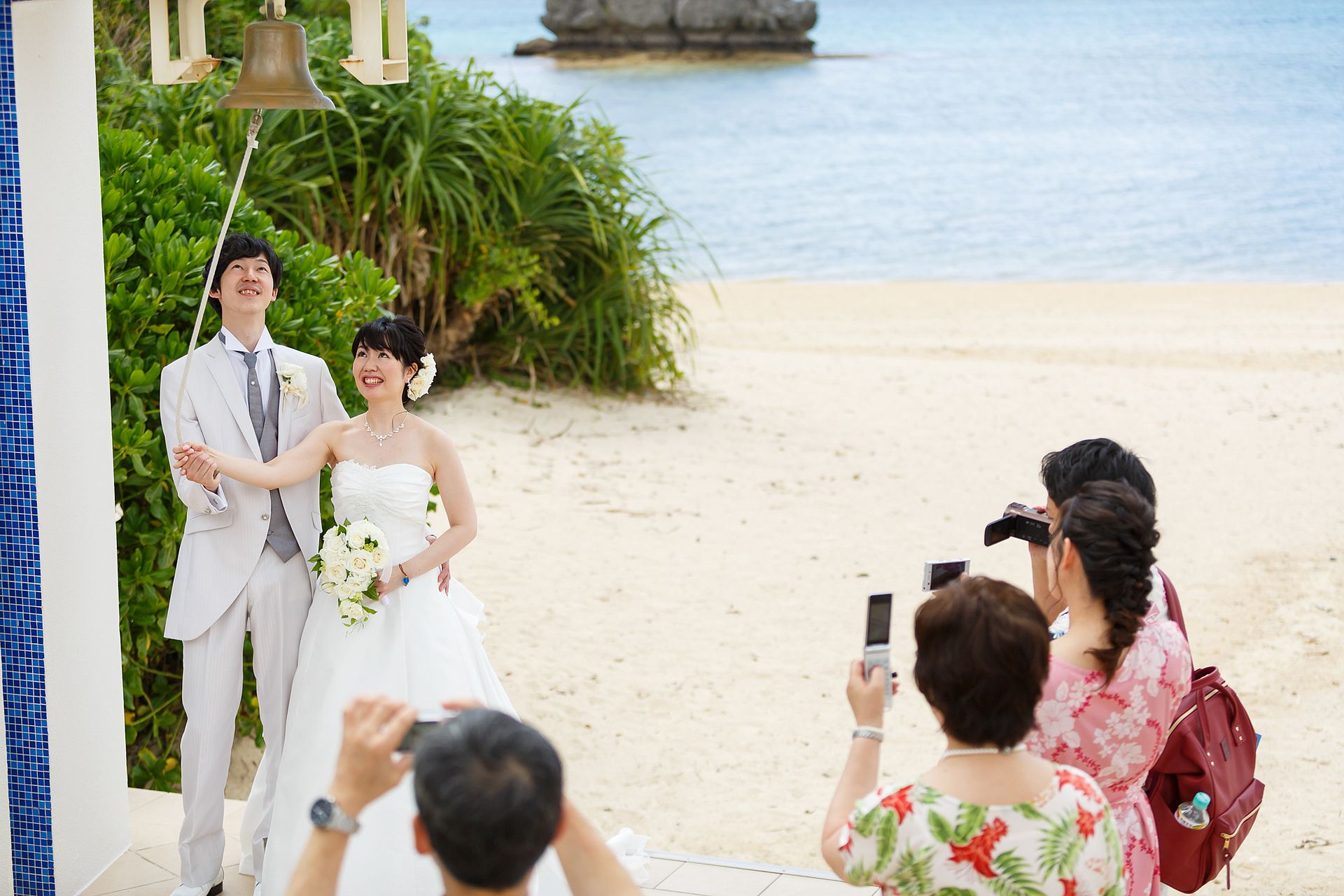 挙式後、オーシャンテラスで幸せの鐘を鳴らし、鐘の音が響き渡る中
