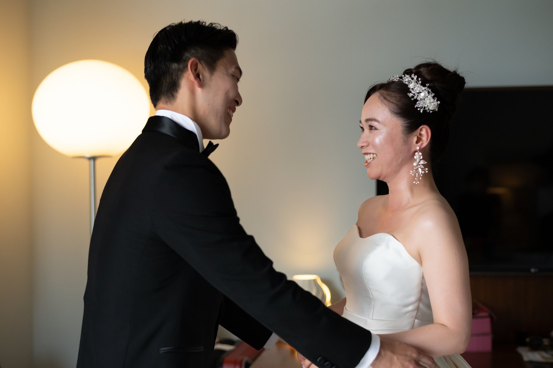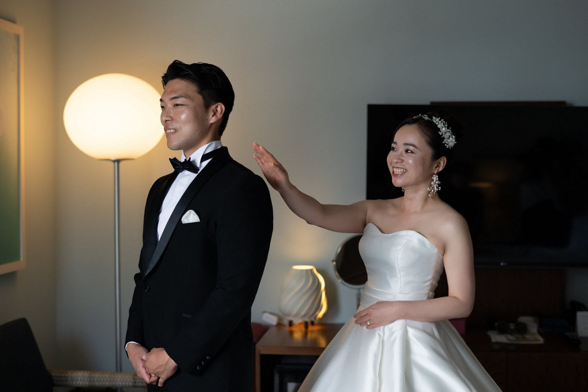 挙式当日、MITSUGI様はドレスをお召いただいたRIMU様と初めてのご対面です!