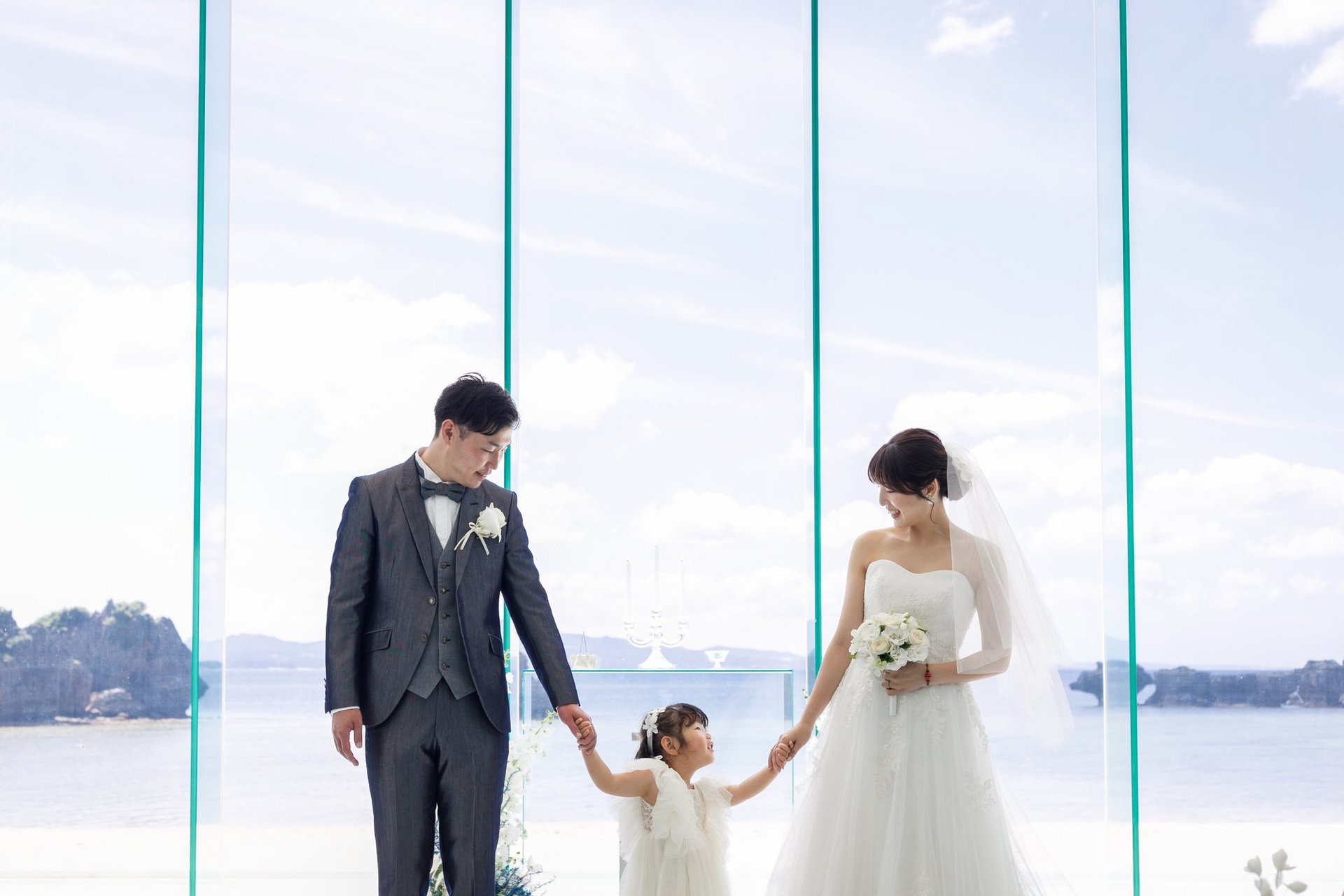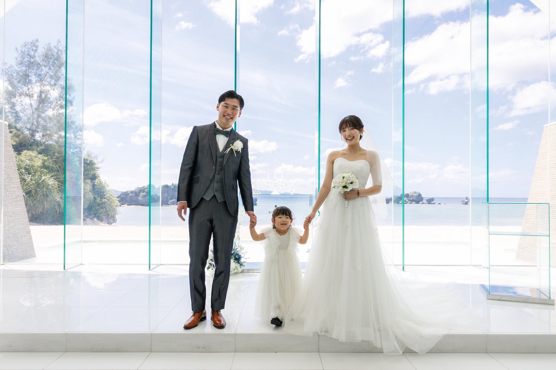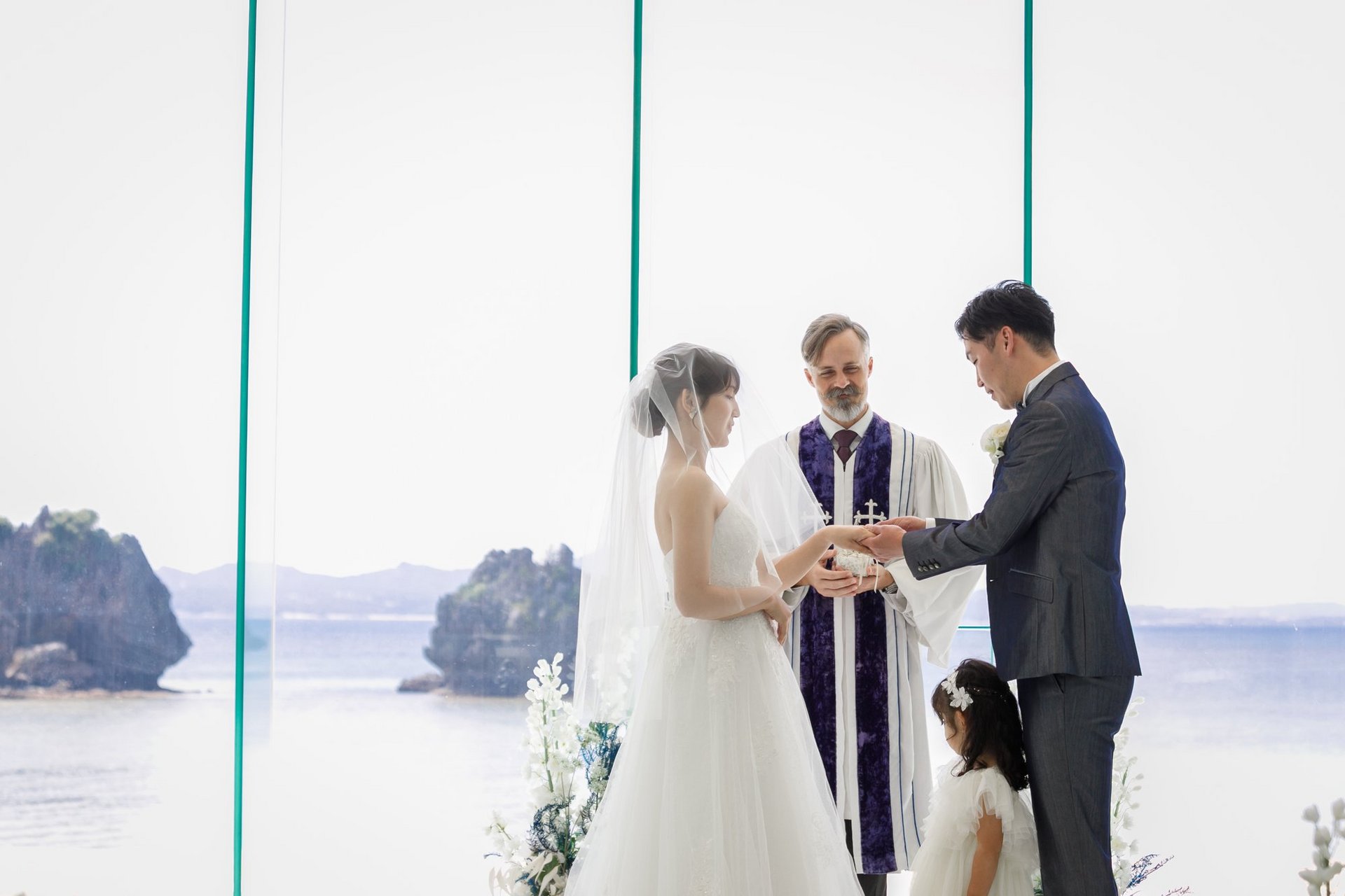 白いチャペルと青い海が覗くチャペルで挙式がスタート!