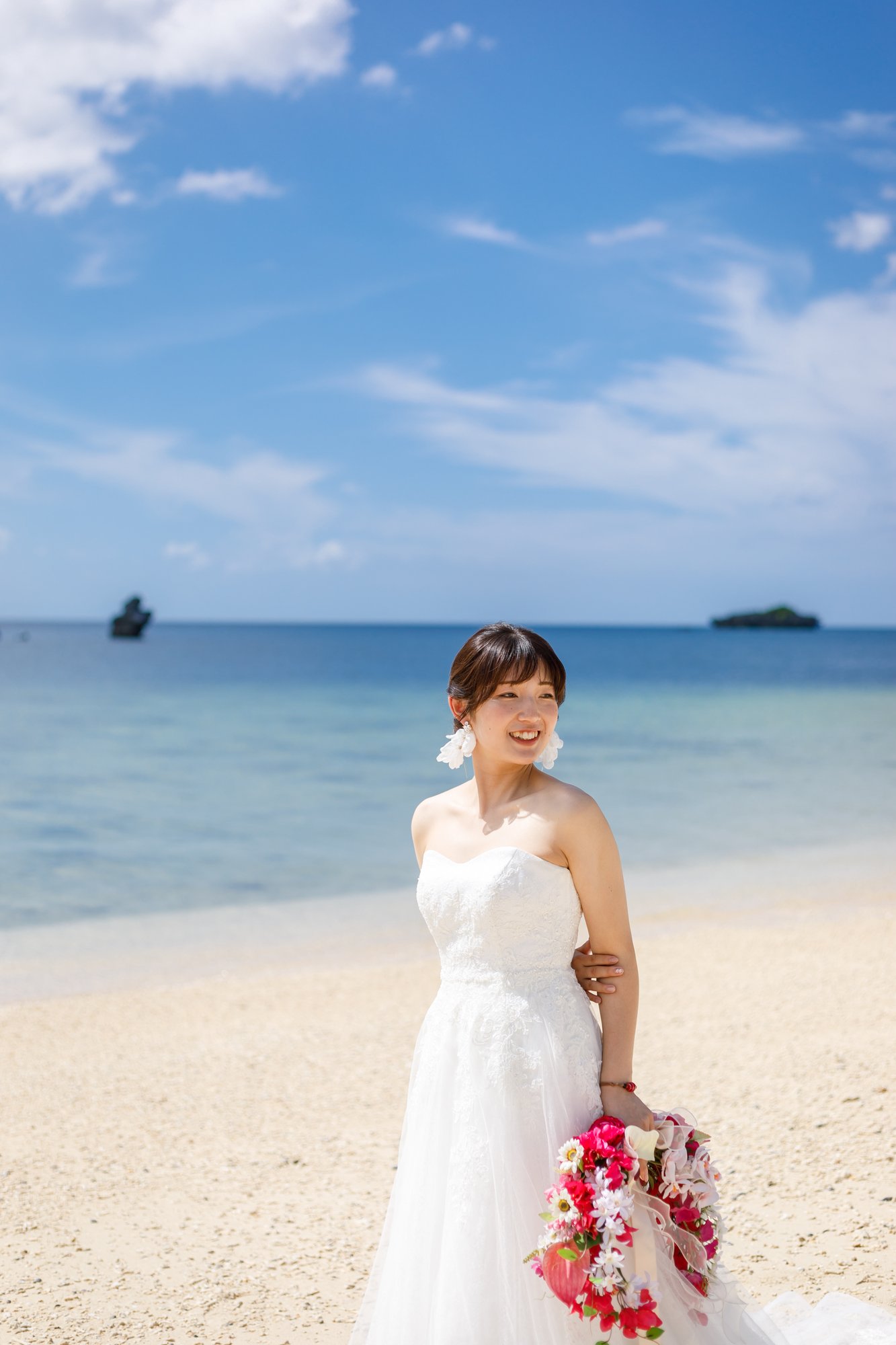 白い砂浜と青い空、綺麗な海をバックに