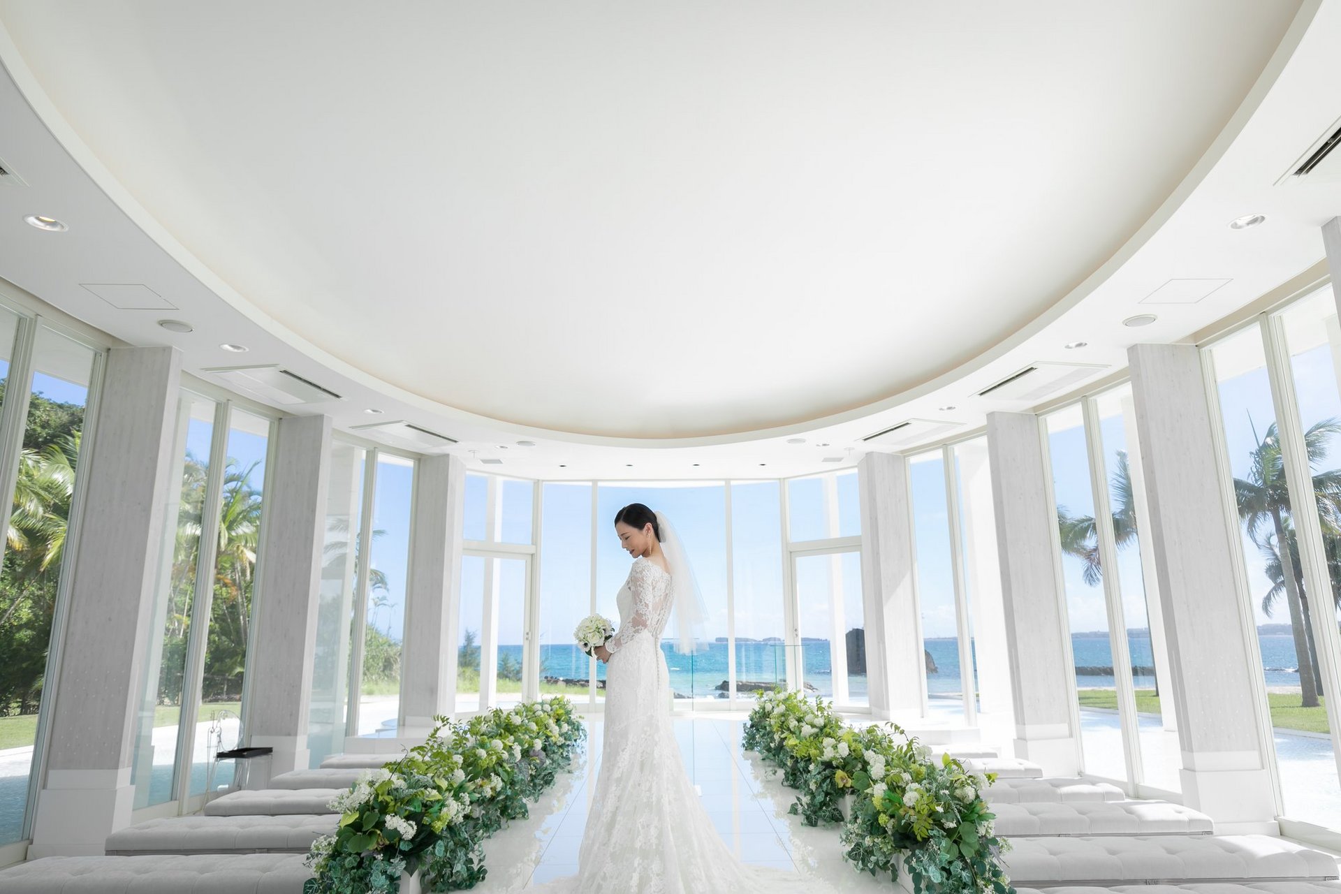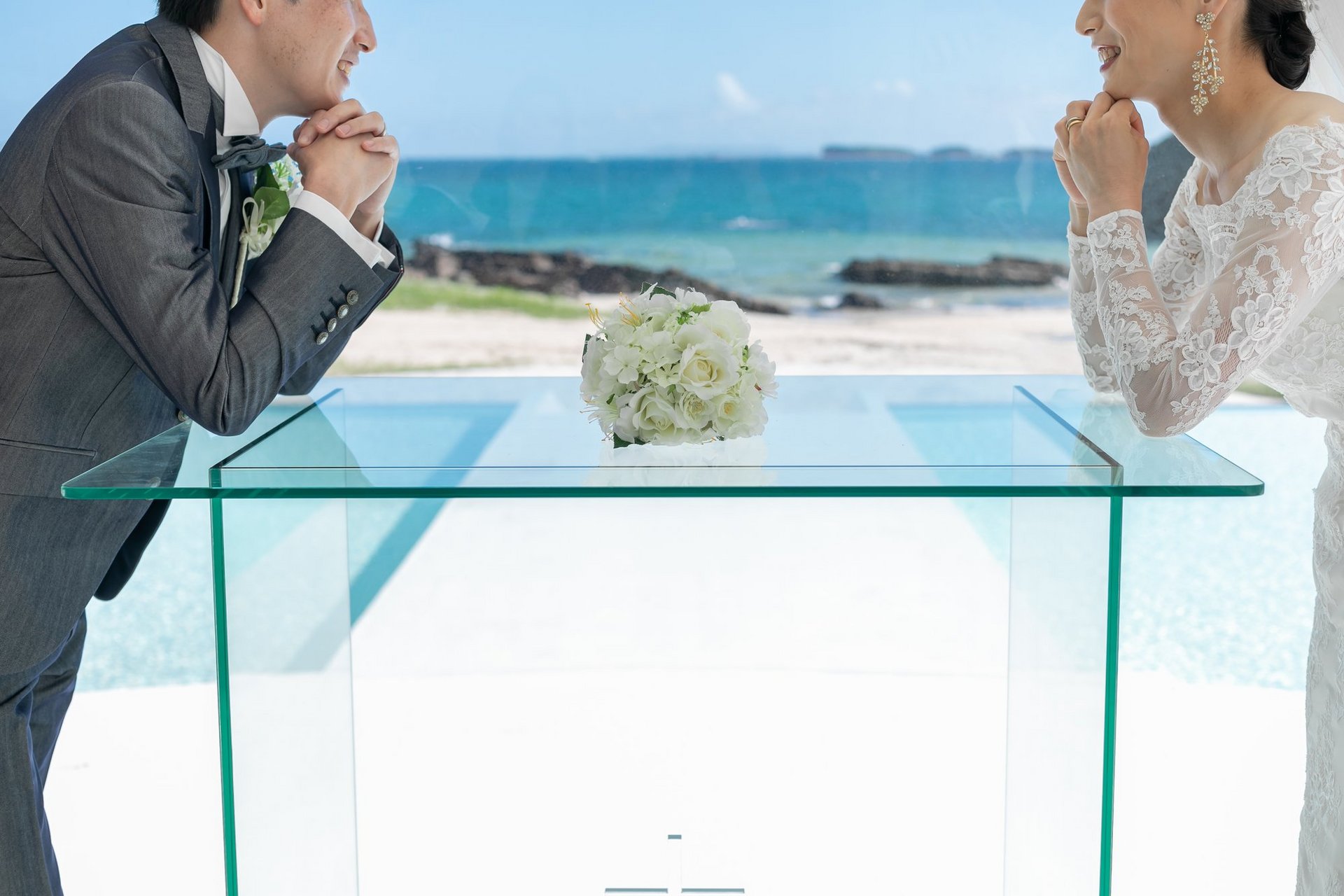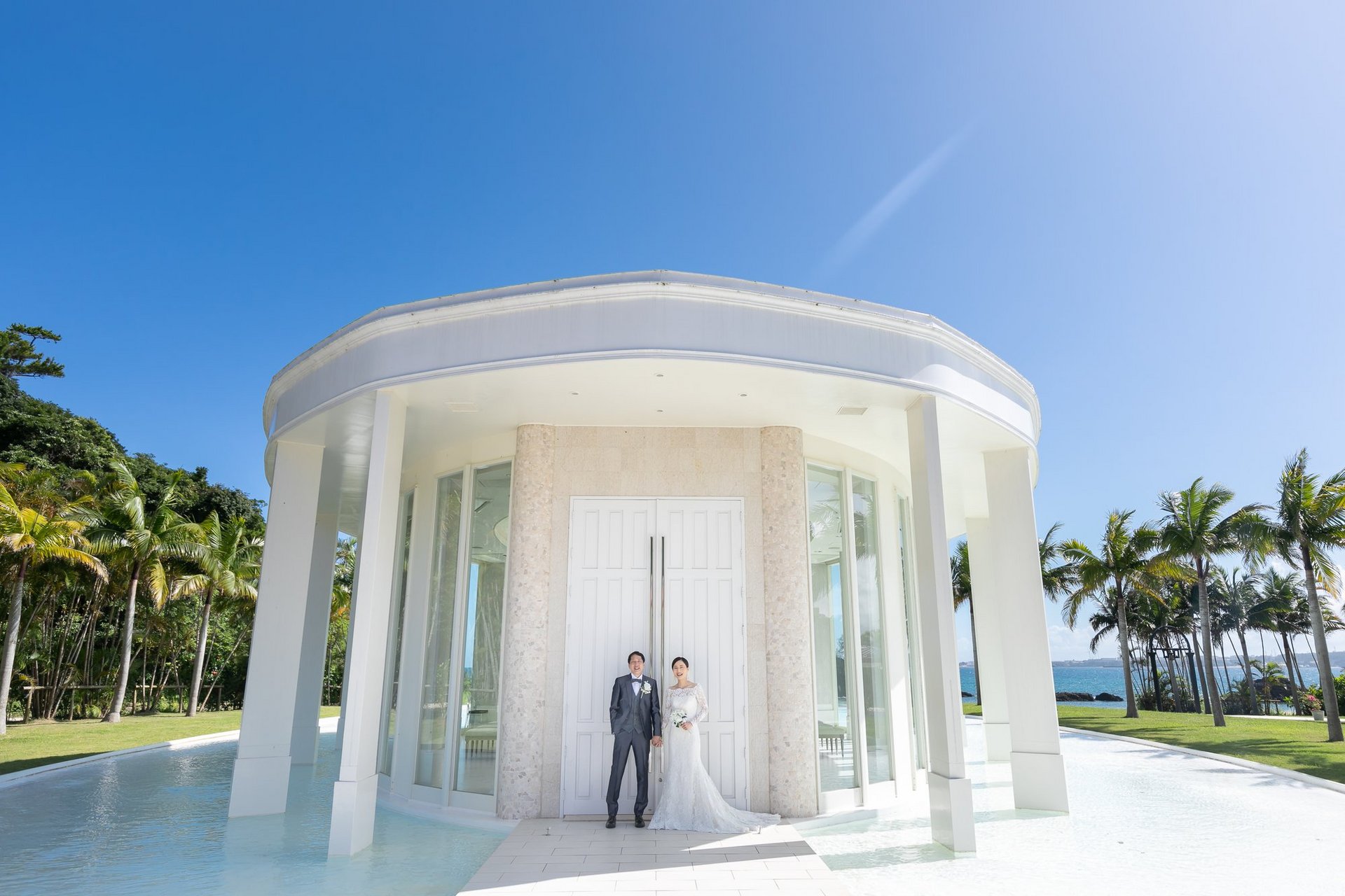 綺麗な海と白いチャペルをバックに