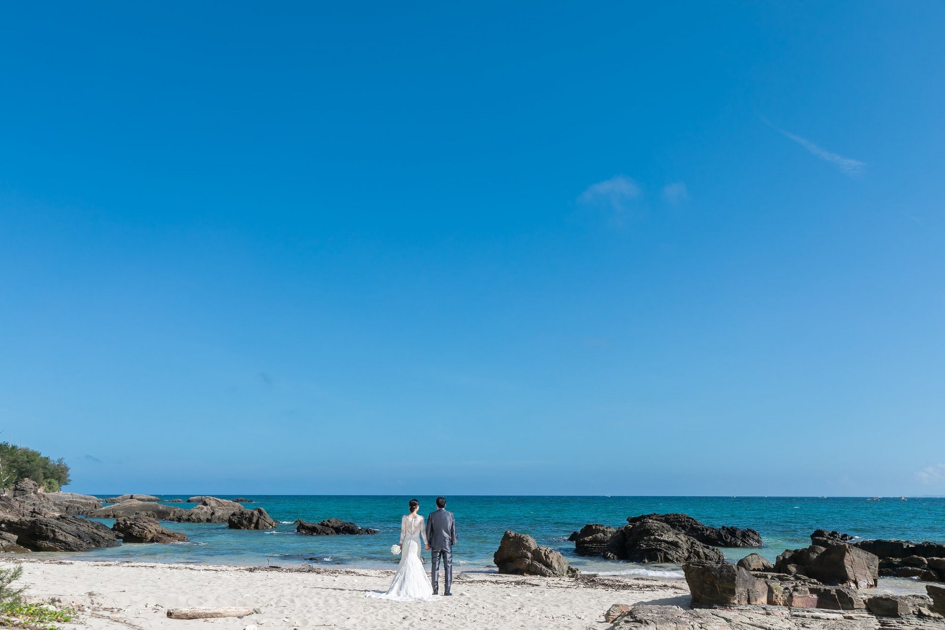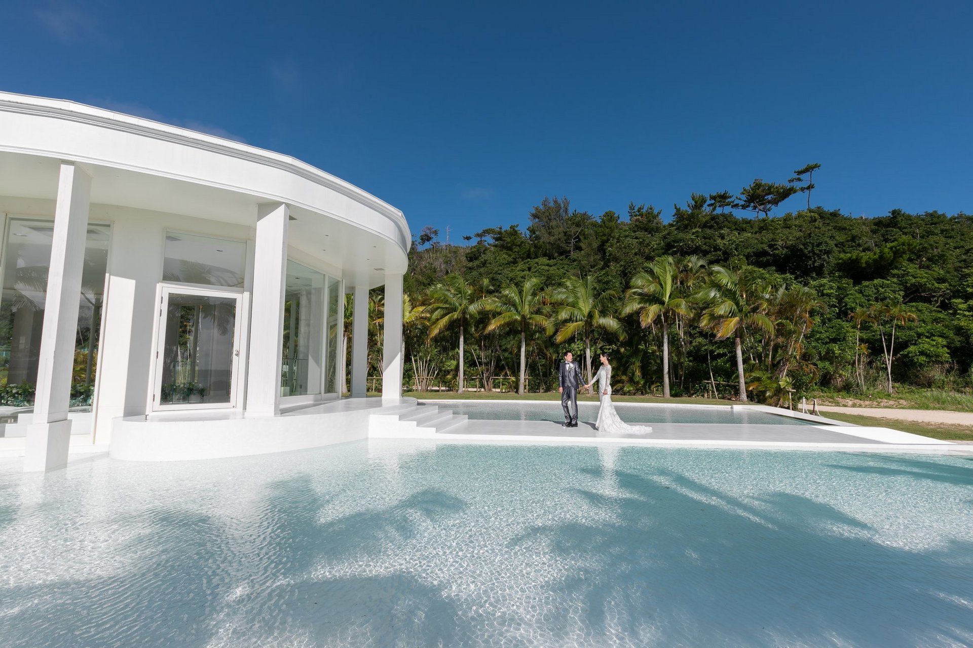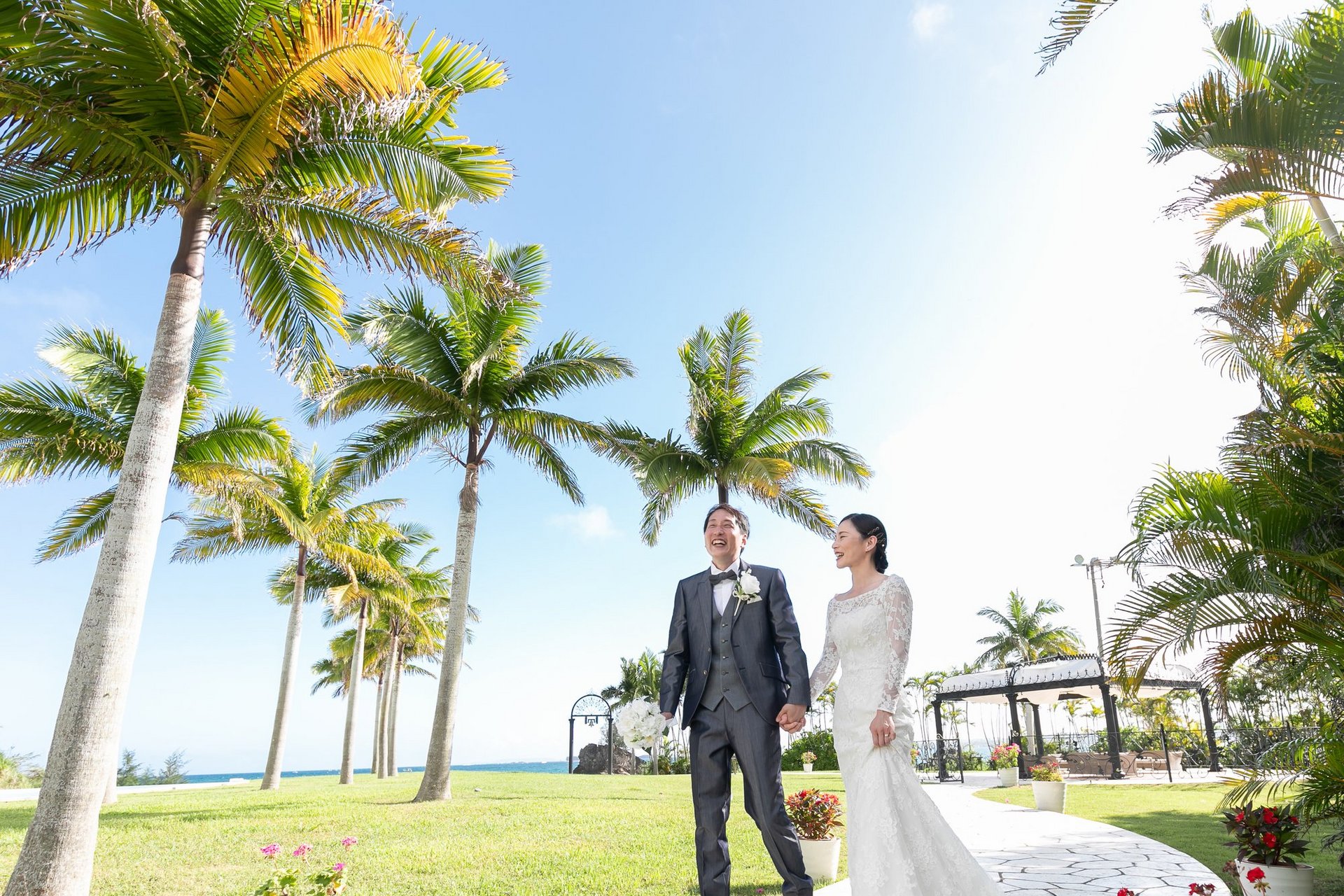 綺麗な海と白いチャペルをバックに