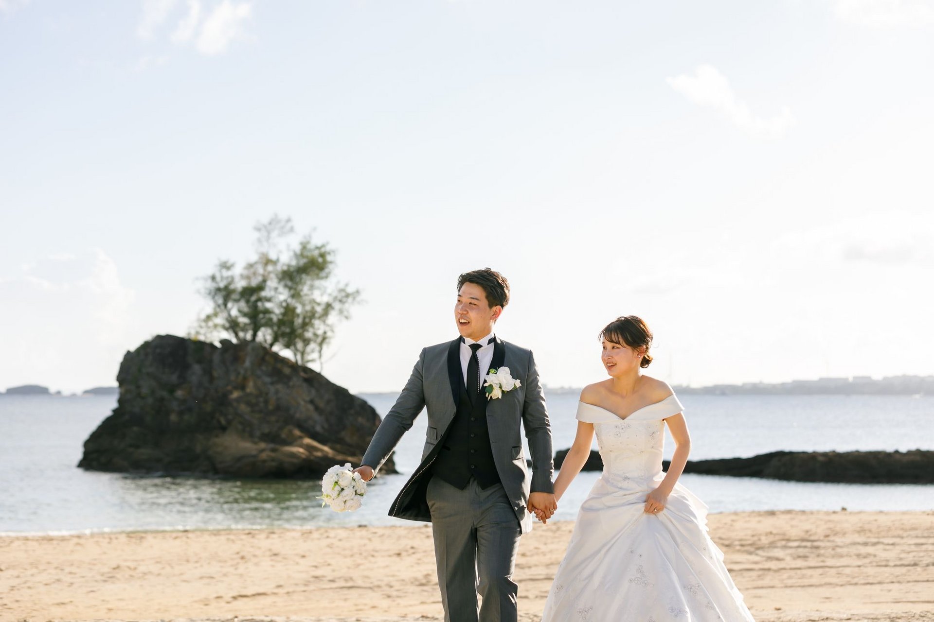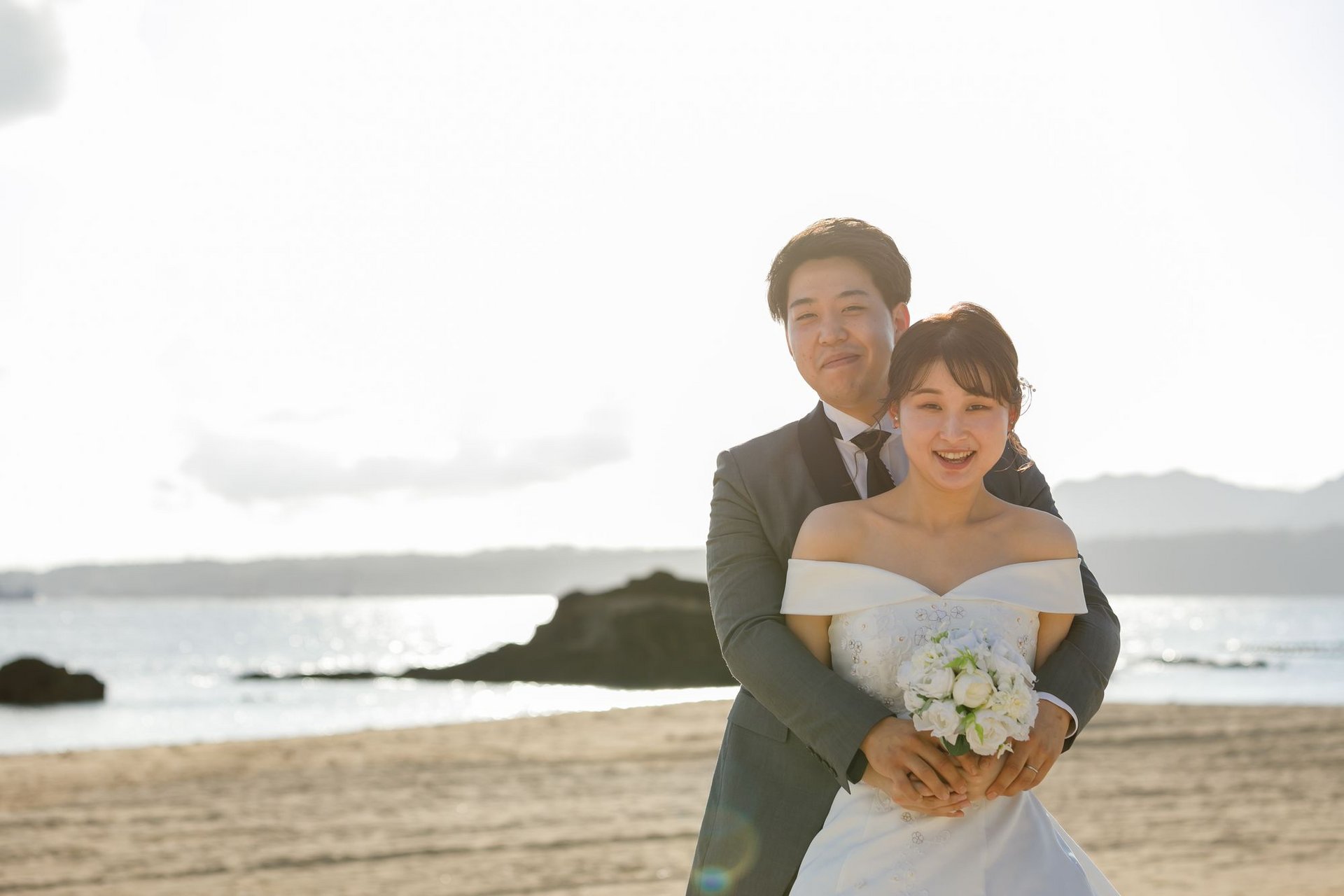 ドレスのトレーンが砂浜に映えて