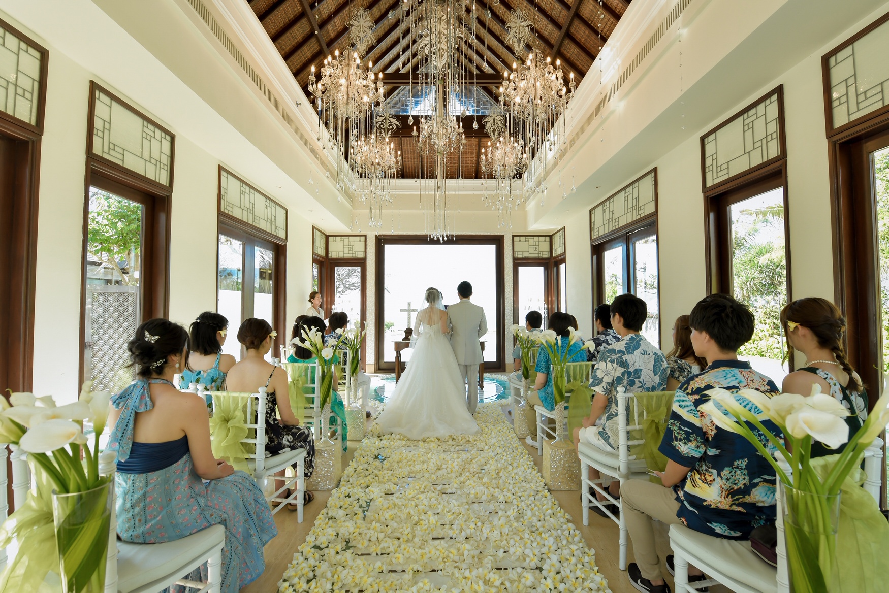チャペルの中は生花のプルメリアがバージンロードいっぱいに敷き詰められており、