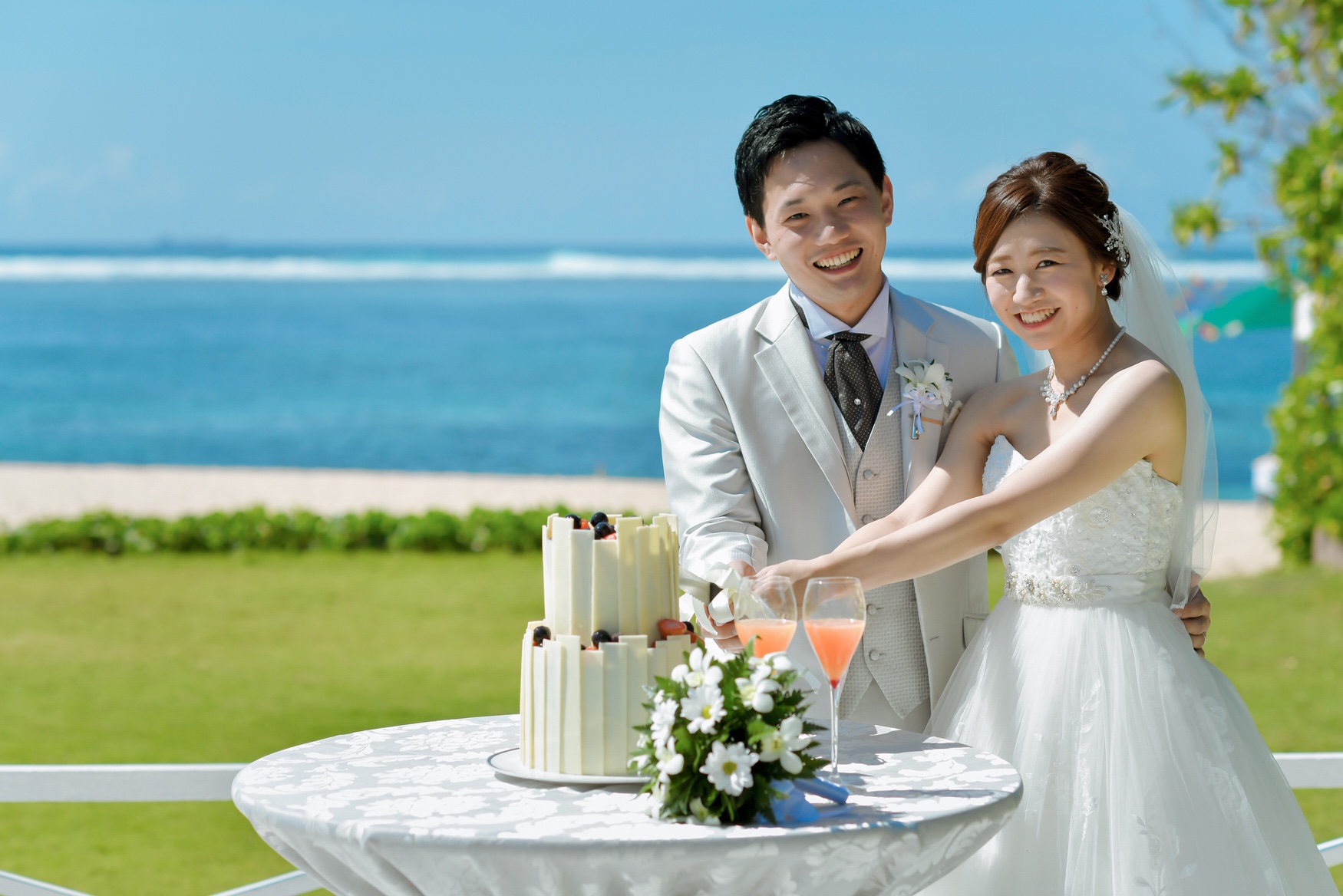 ガーデンでのケーキカット&乾杯もリゾートウェディングならではの解放感で、