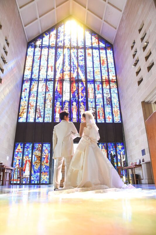 ステンドグラスから差し込む光が優しくお2人を包み込んでいるようです。
