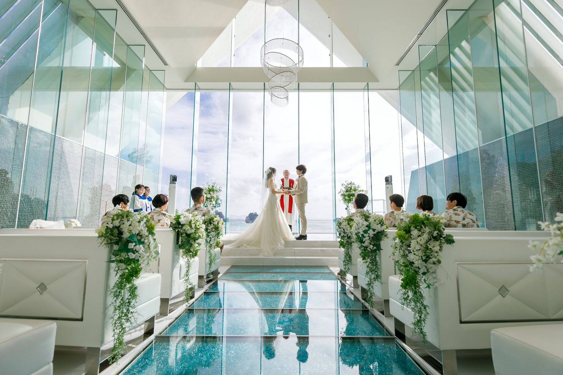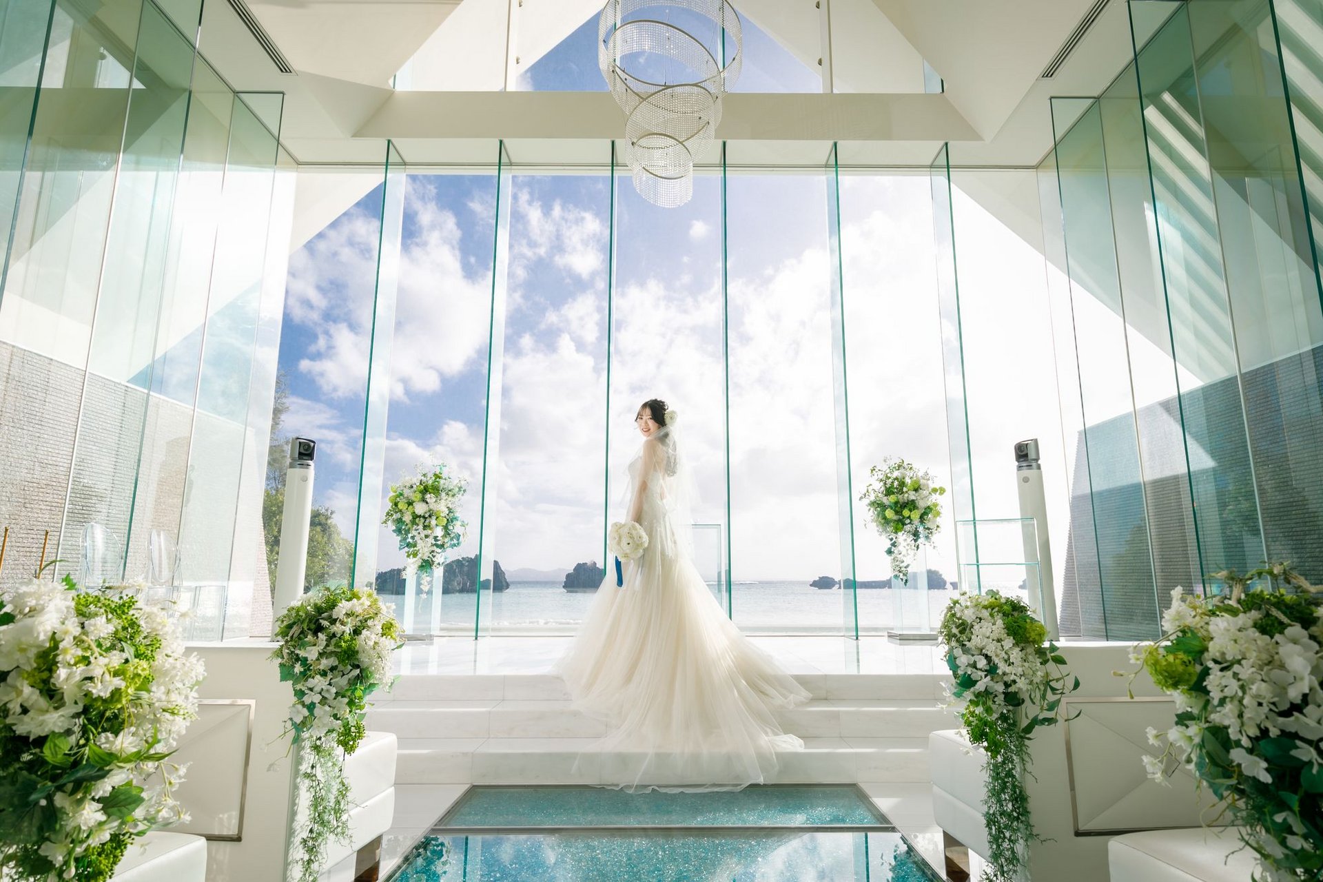 ブルーのバージンロードにうつるお二人の姿も素敵です♪