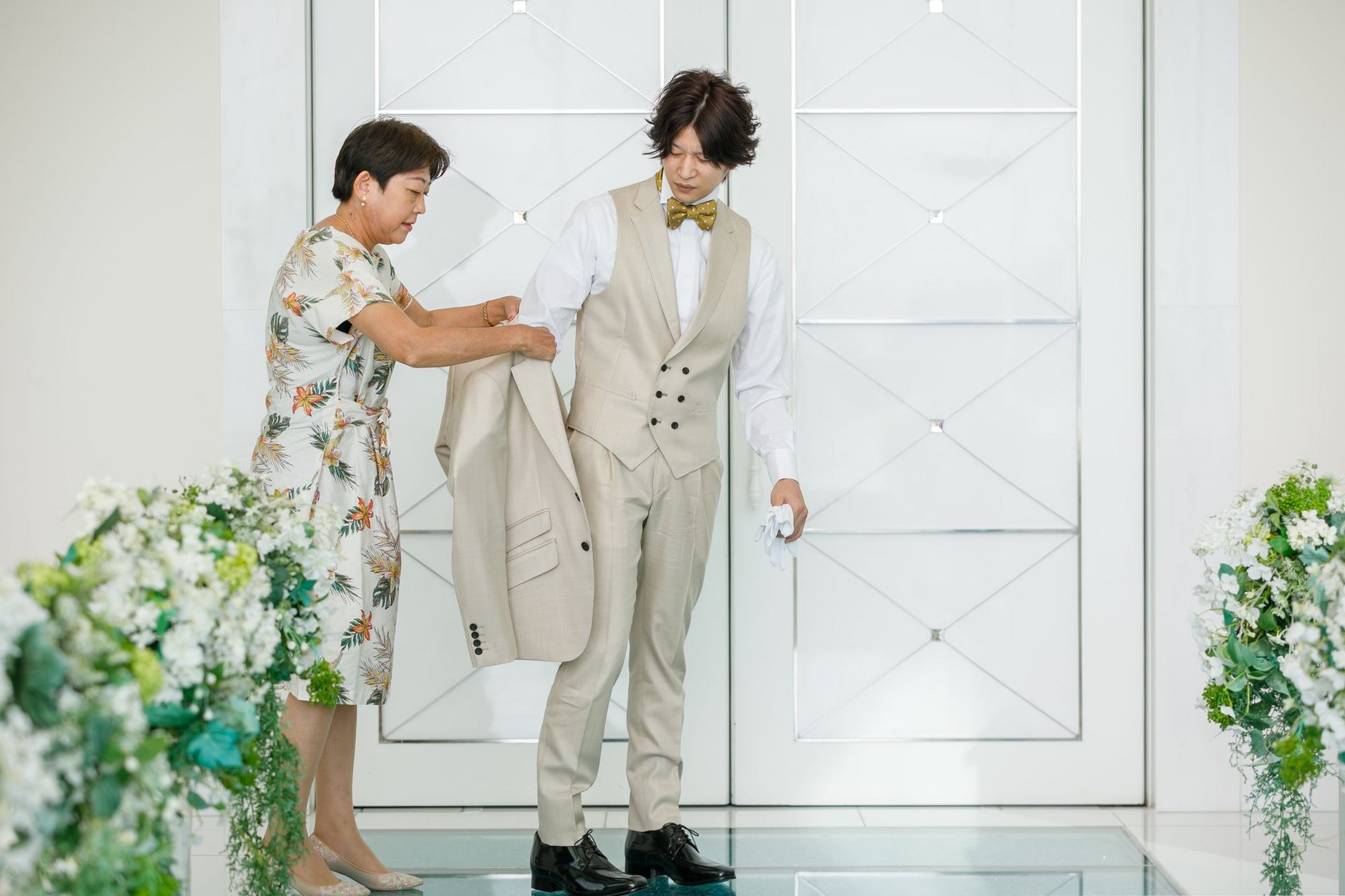 新郎様の最後のお支度をお母様にお手伝いいただきます。