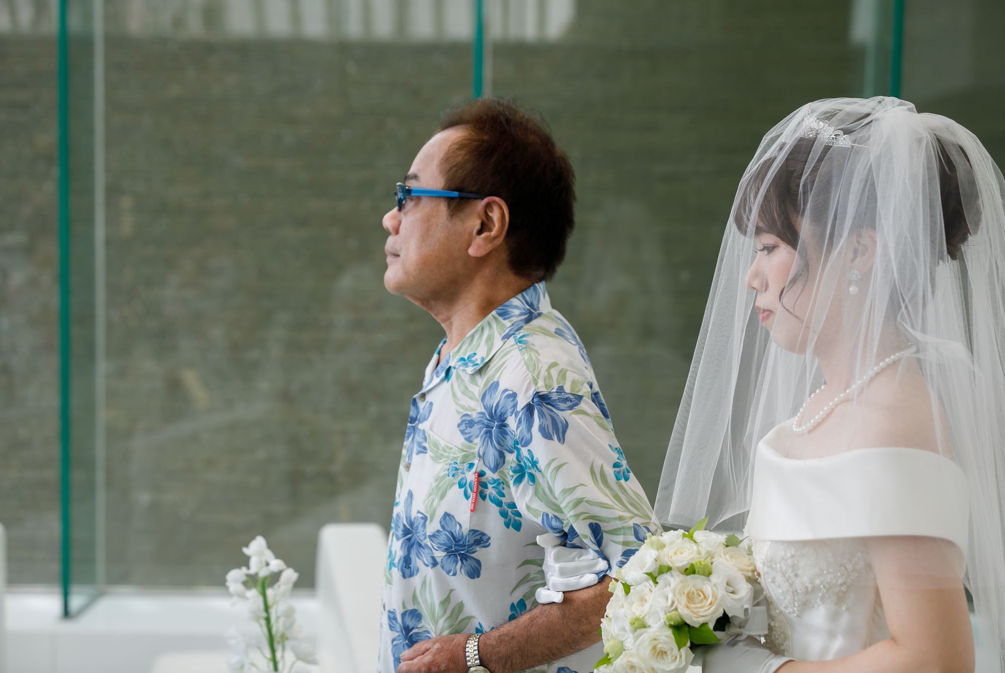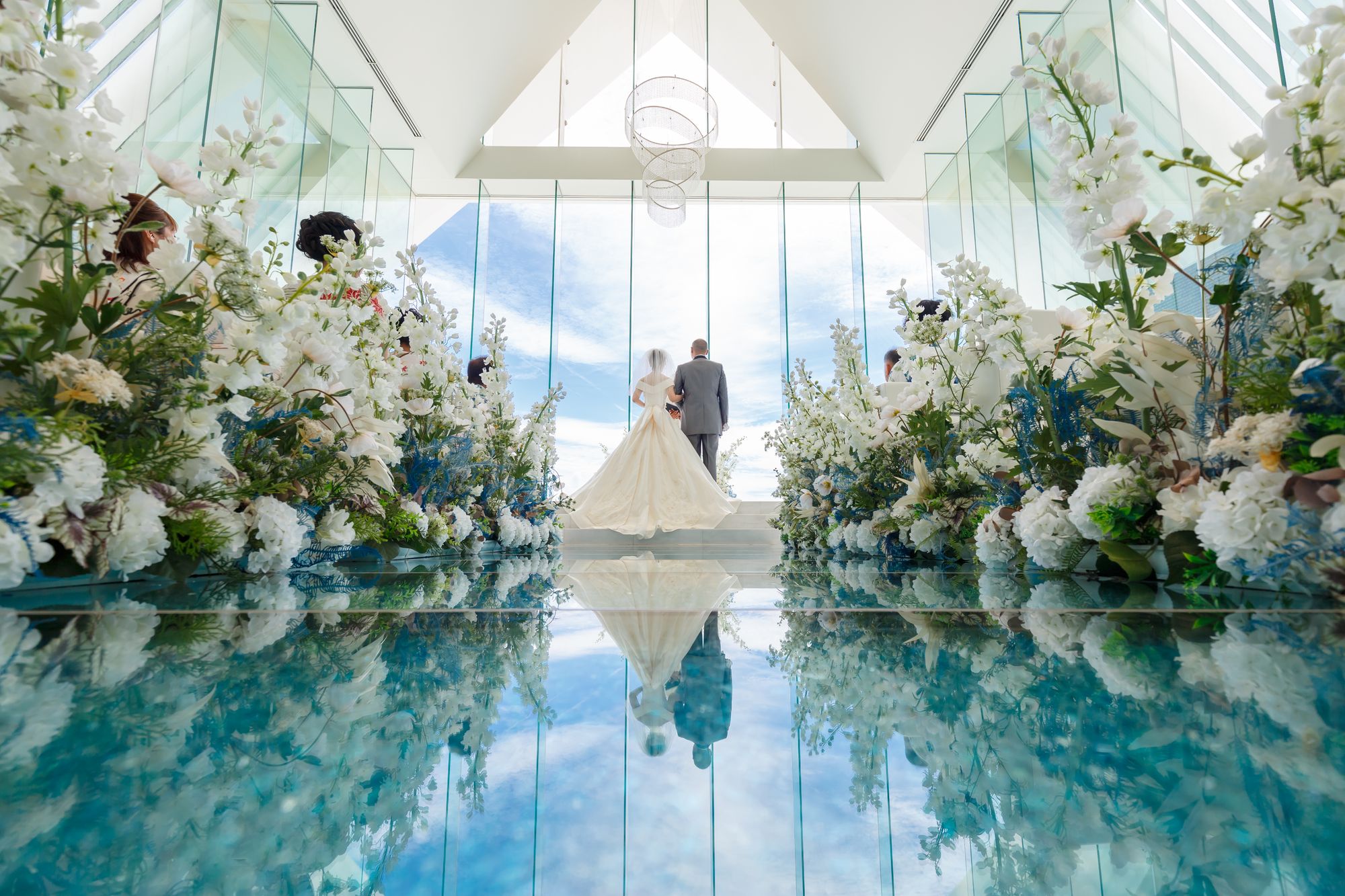 ベールダウンの後はお父様と共にブルーのバージンロードの上を