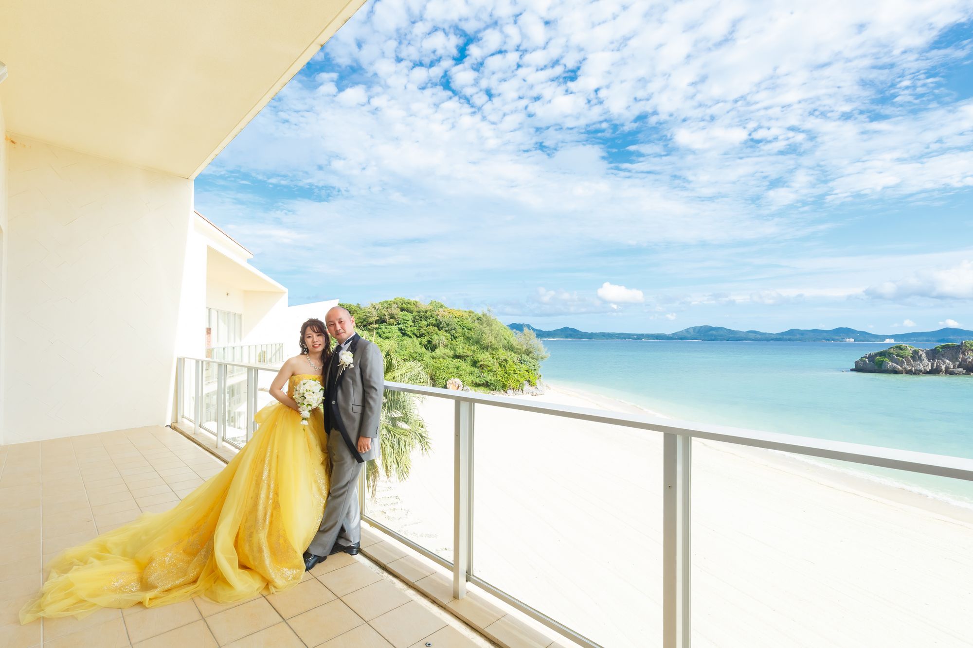 青い海とイエローのドレス、よく合っていますよね◎