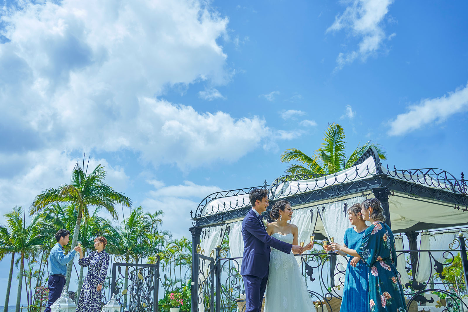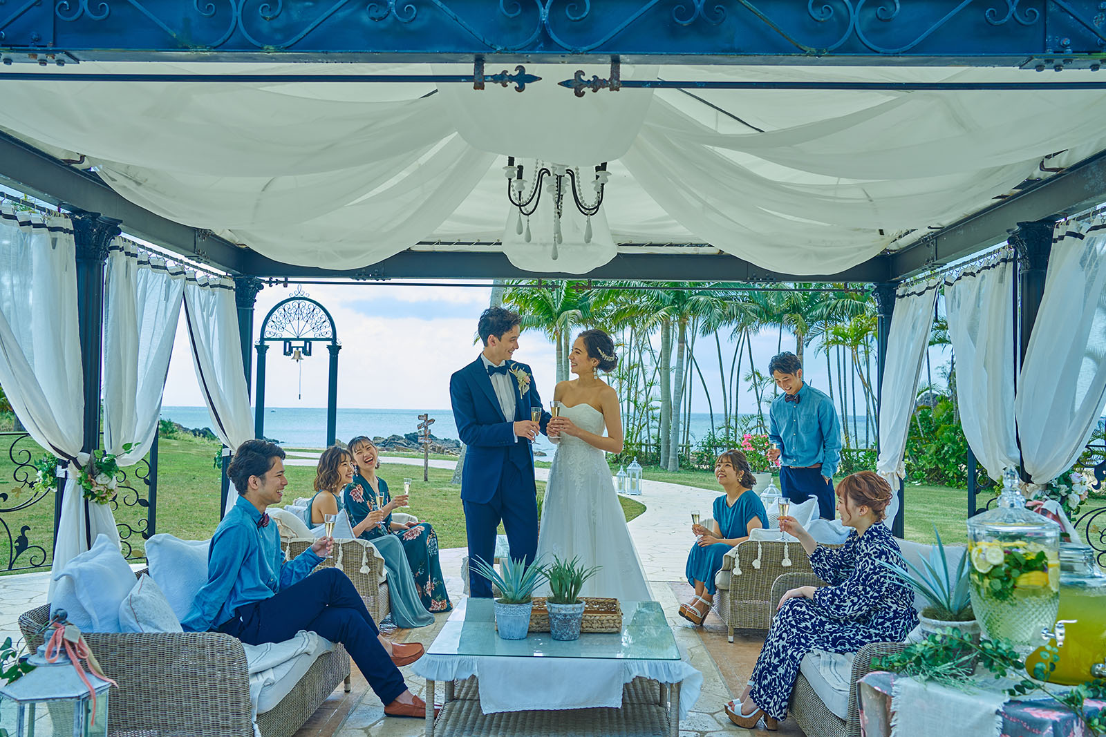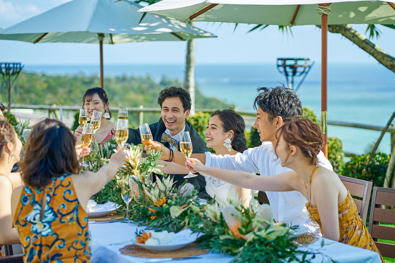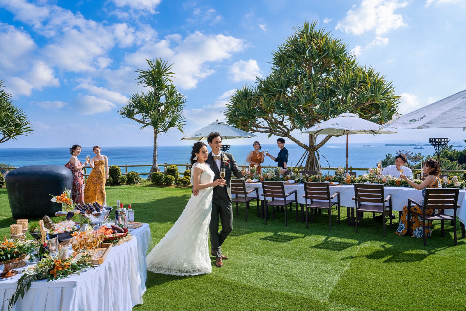 婚禮儀式結束后,可以在花園内舉辦婚宴前的歡迎酒會。一邊享受花園美景,一邊享用清涼飲品和冲繩的熱帶水果。