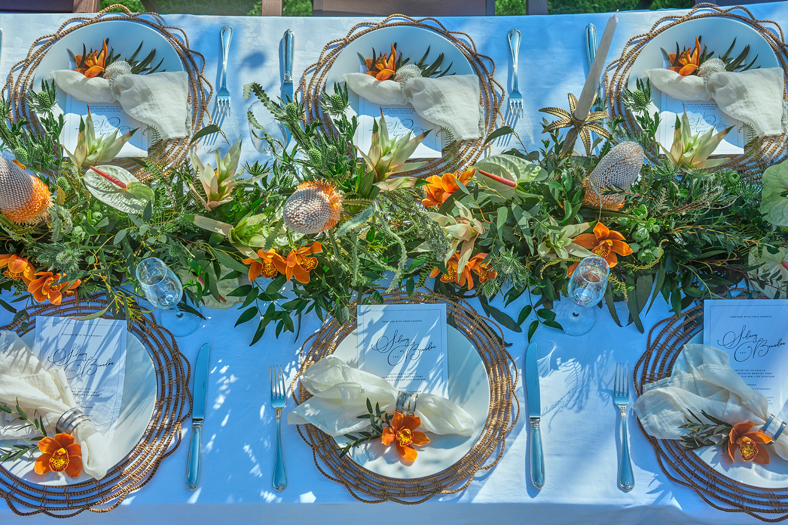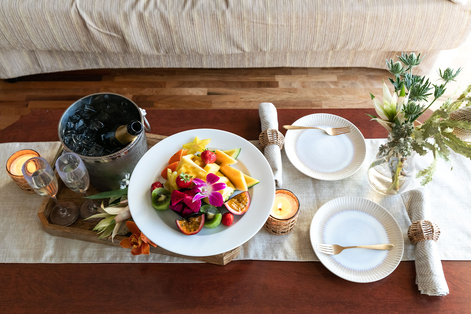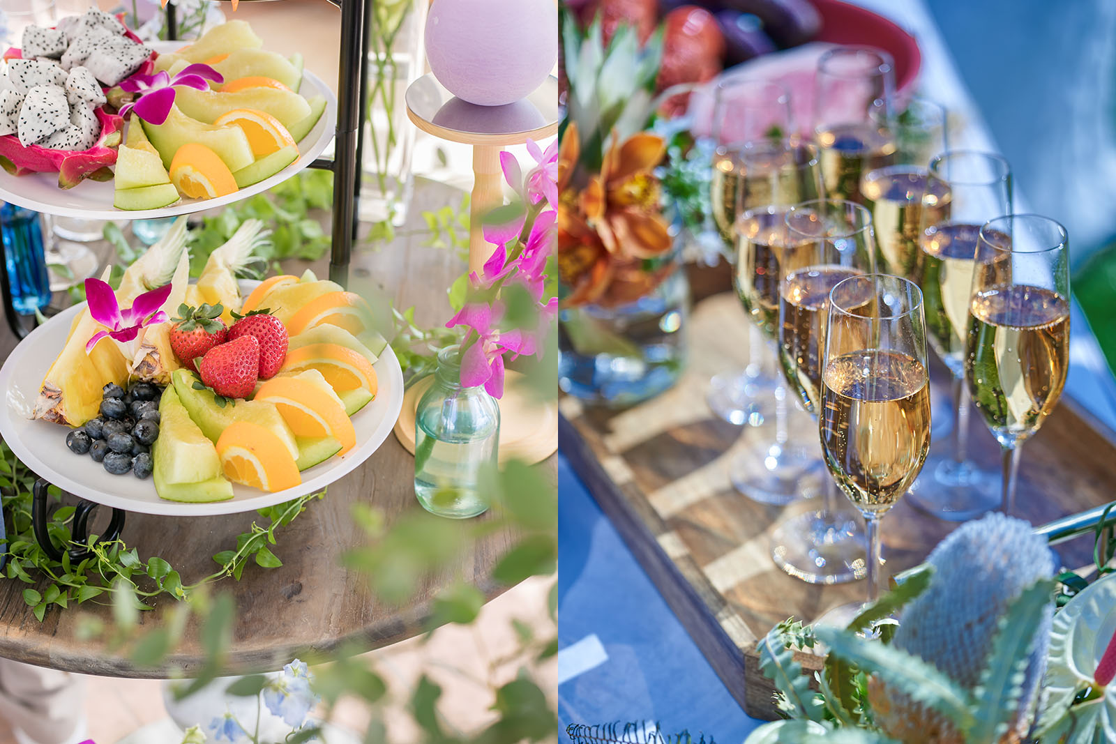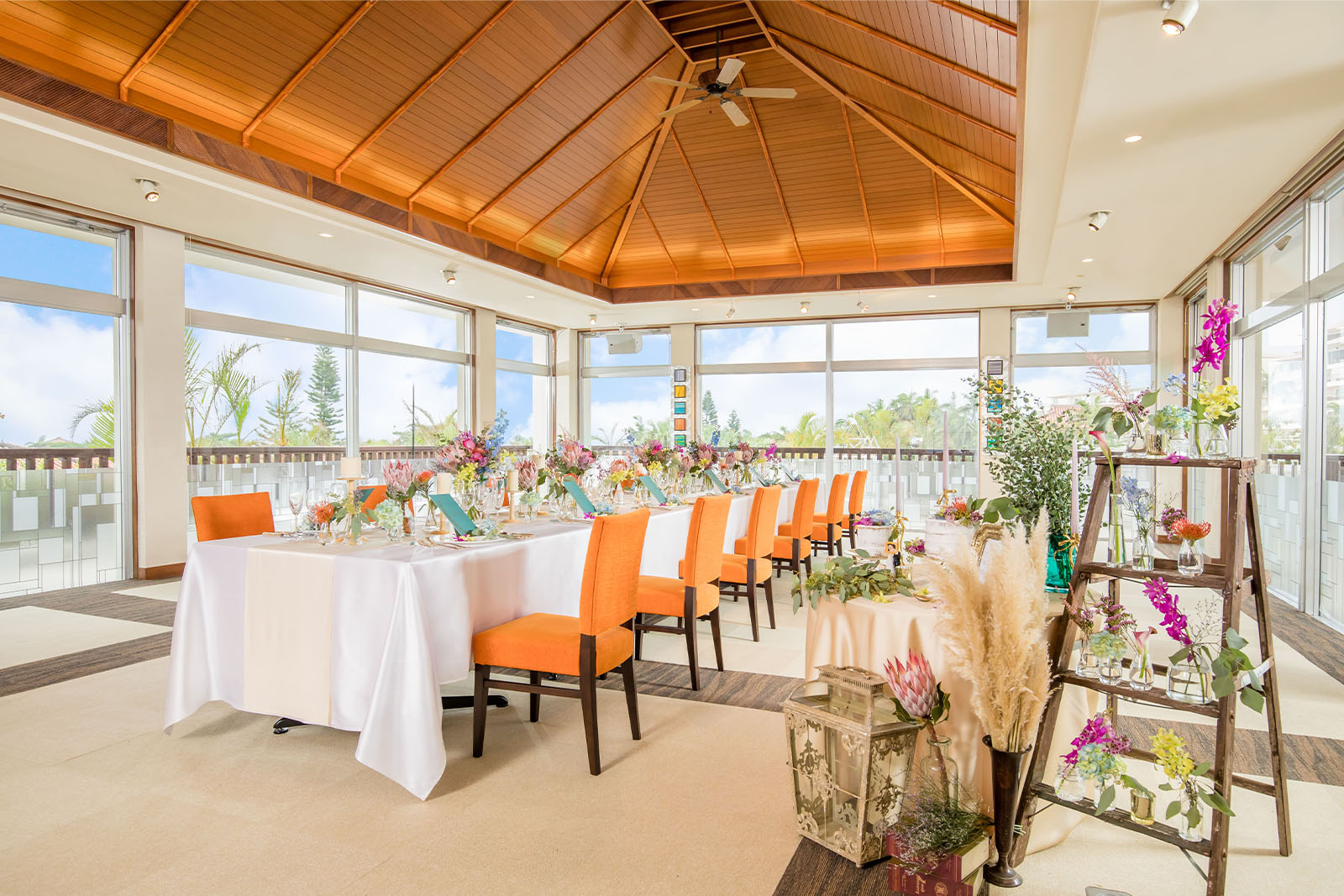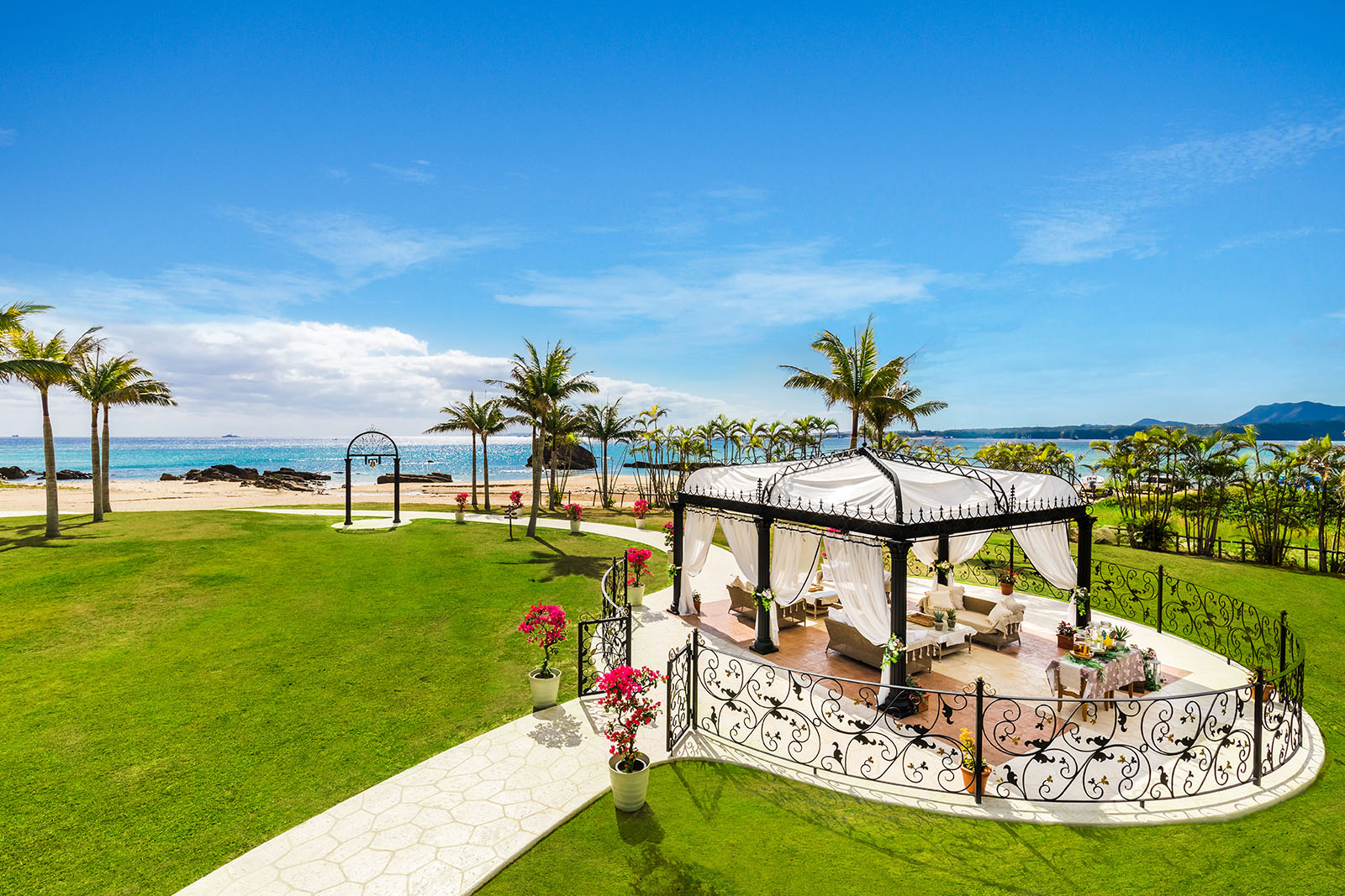 婚禮儀式結束后,可以在花園内舉辦婚宴前的歡迎酒會。一邊享受花園美景,一邊享用清涼飲品和冲繩的熱帶水果。