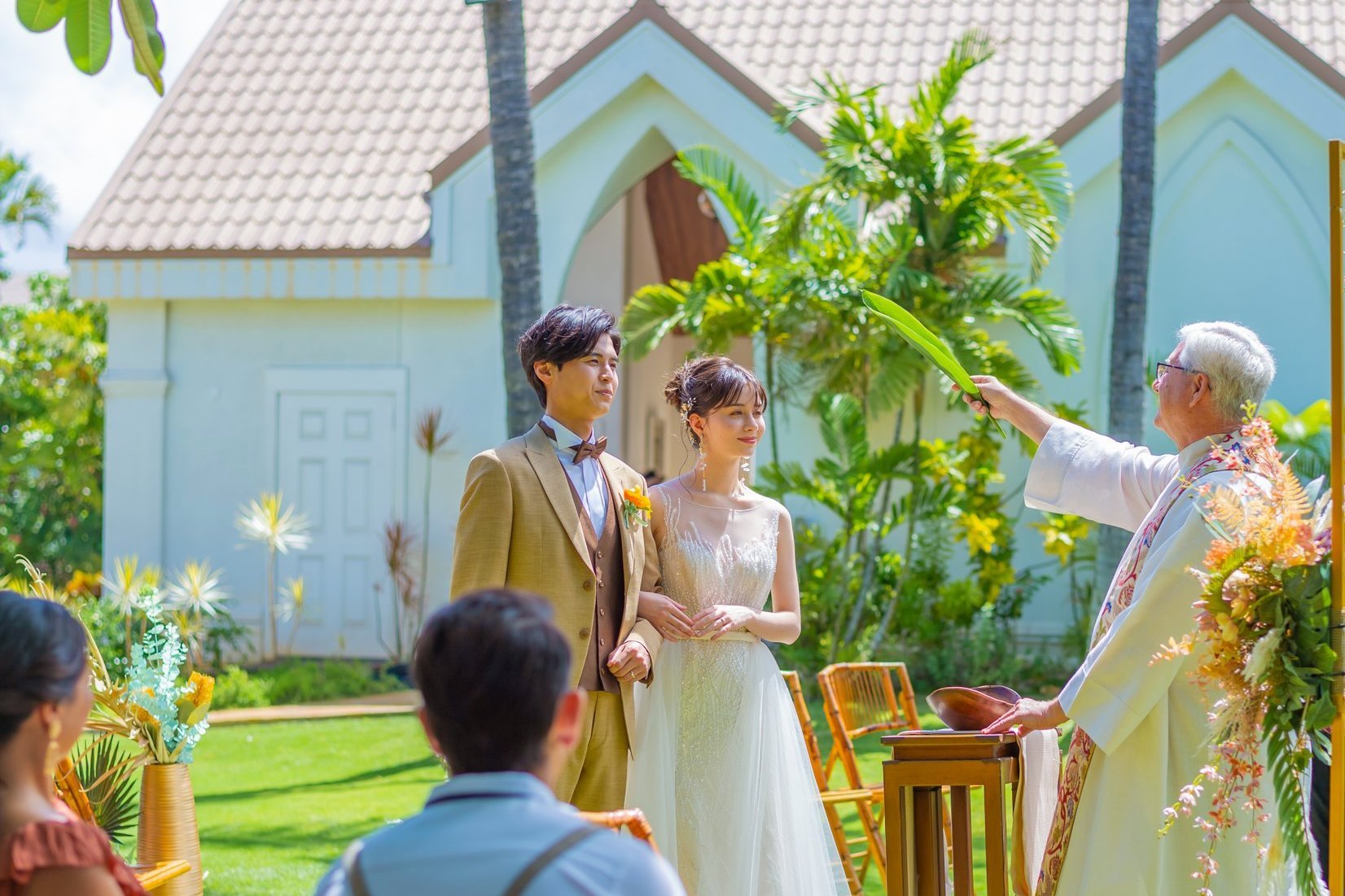 ガーデン挙式では、“水のセレモニー(Ho'omaika'i)”も含まれます。神聖な力が宿るティーリーフと、ひと粒のハワイアンソルトに清められた聖水を使ったオリジナルのブレッシング。