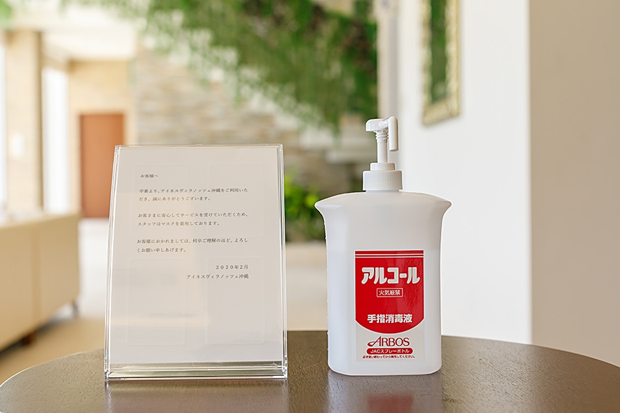 お客様におかれましても、店内各所、化粧室内にご用意しております消毒液ご利用いただき、体調や気分が優れない際はお近くのスタッフまでお申し出下さい。