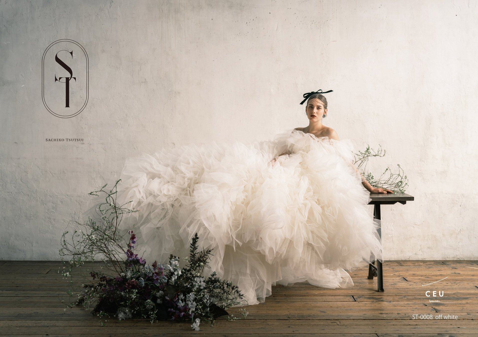 デザイナーとしての想い、20 年という時のなかで培ってきた経験と技術、そして“好き”を詰め込み、作りたいものと今の花嫁が求めているもの、そのイメージを膨らませて【 SACHIKO TSUTSUI 】は作られています。