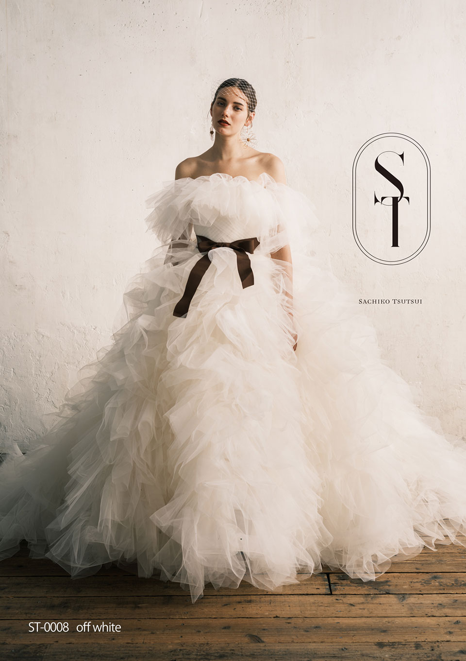 デザイナーとしての想い、20 年という時のなかで培ってきた経験と技術、そして“好き”を詰め込み、作りたいものと今の花嫁が求めているもの、そのイメージを膨らませて【 SACHIKO TSUTSUI 】は作られています。