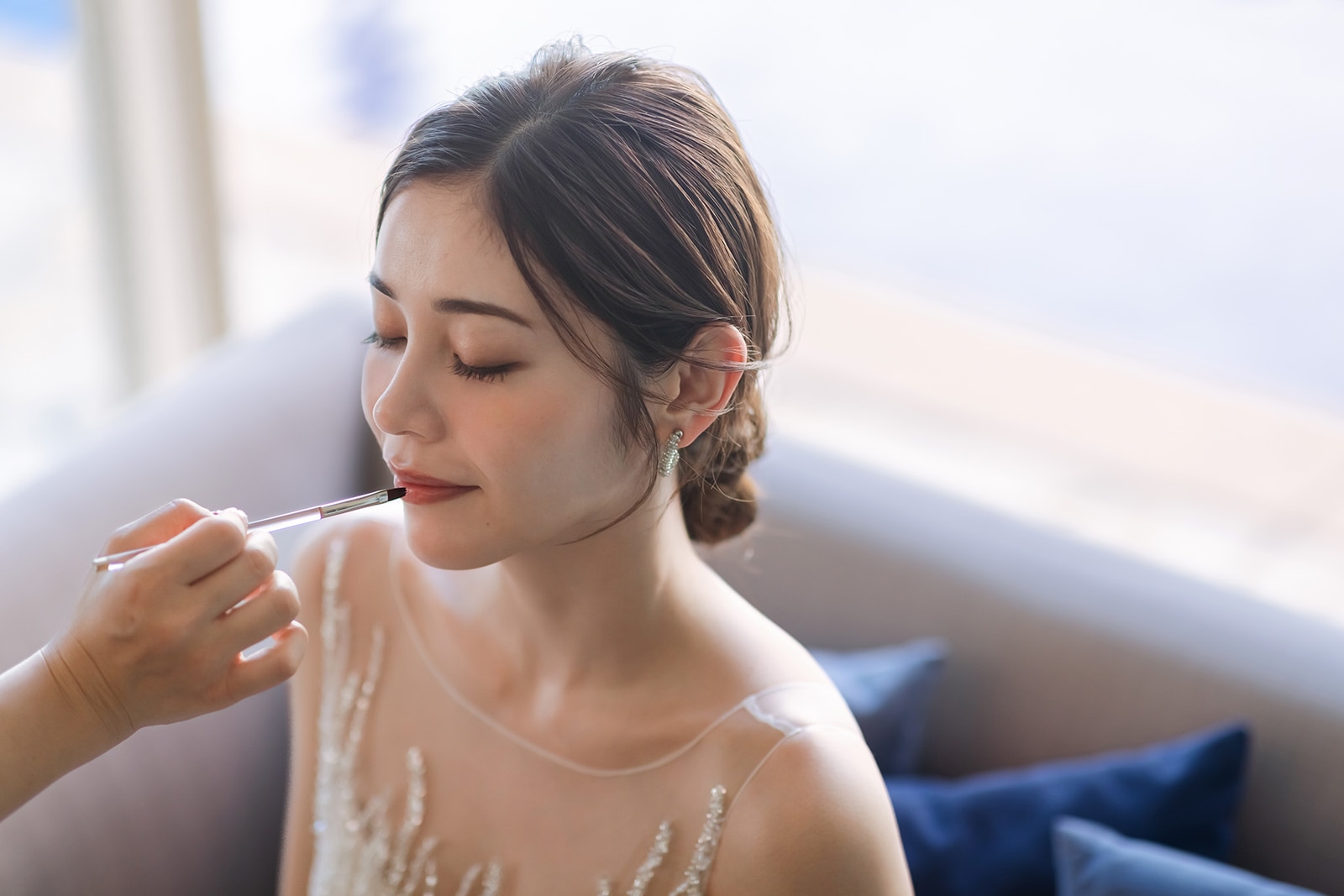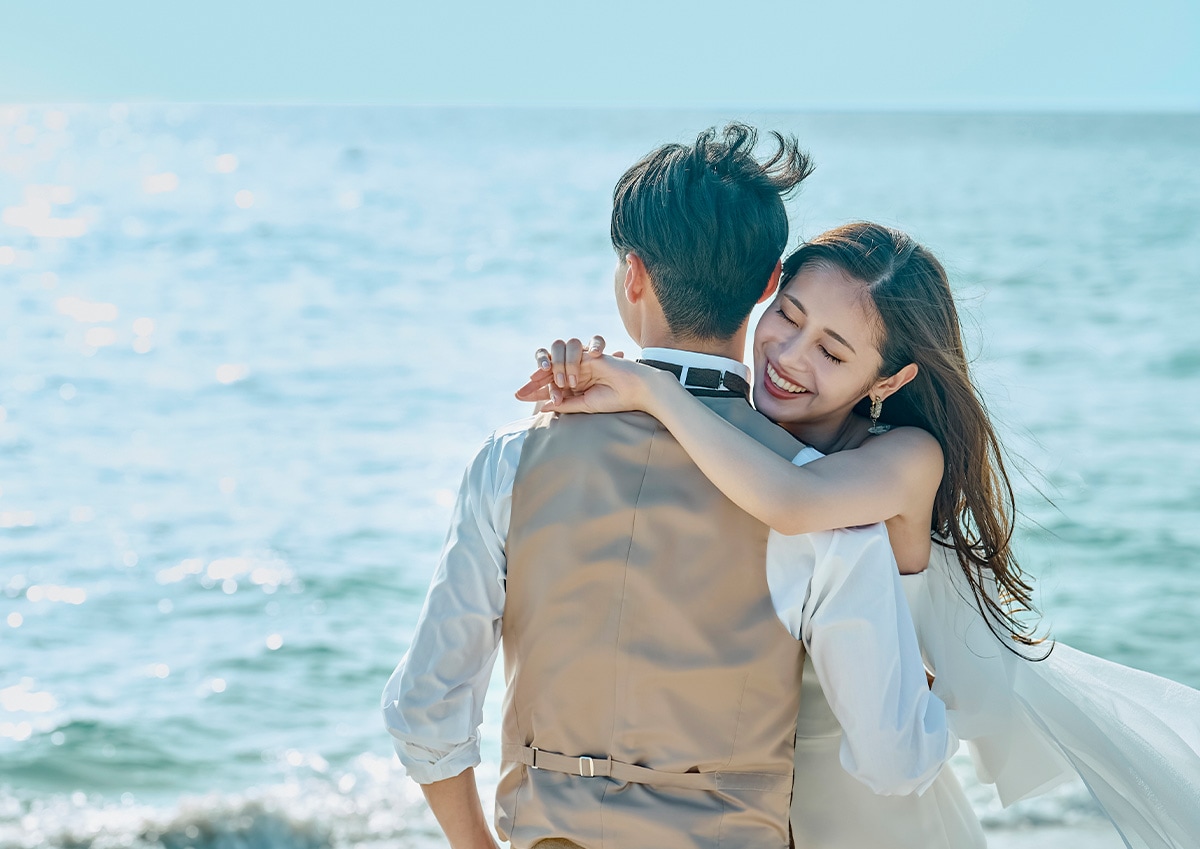 事前に日本国内のクチュールナオコサロンで試着し、衣裳を予約。日本で決めたお気に入りのドレスと同じデザイン、サイズのドレスを海外や沖縄などのリゾート地でご利用いただけます。