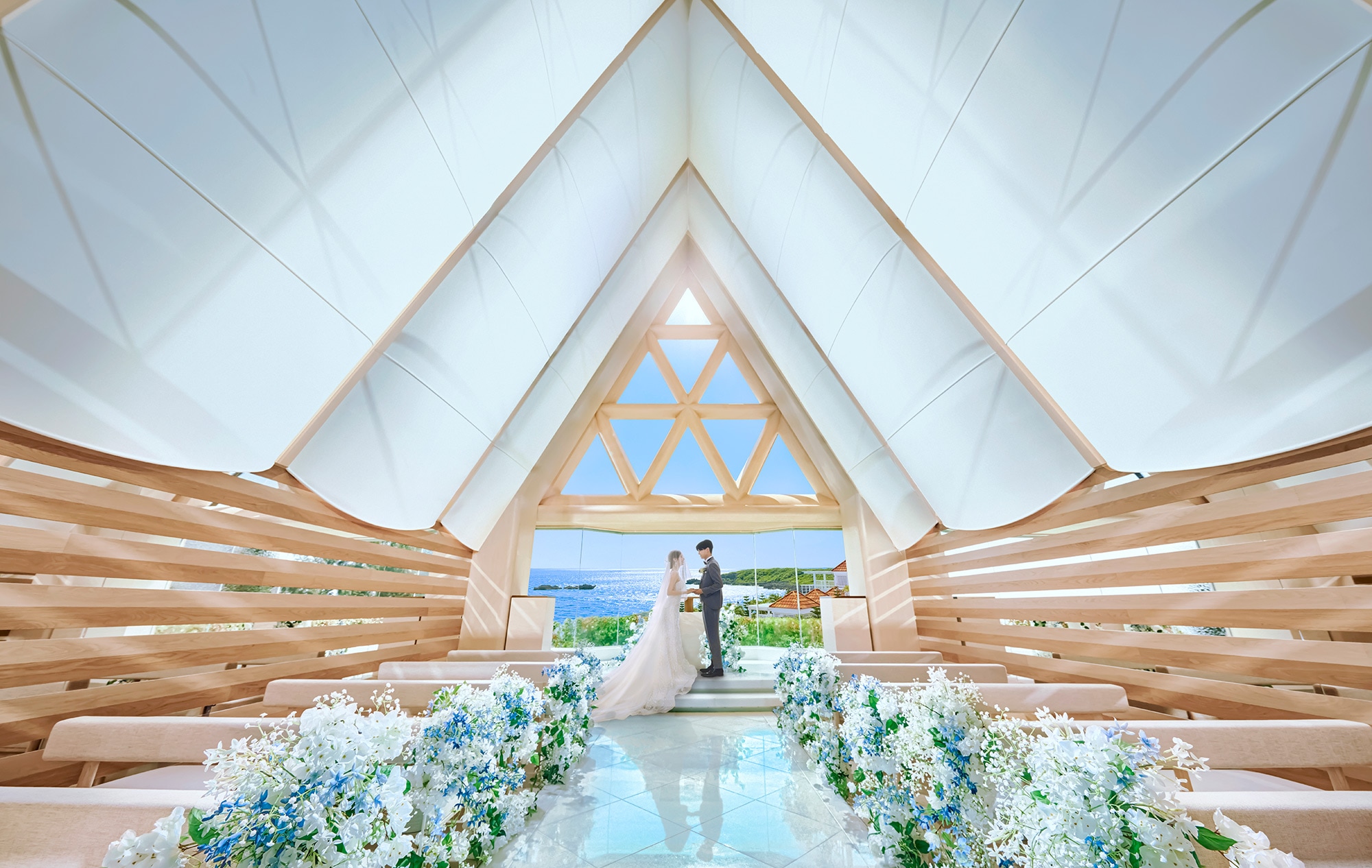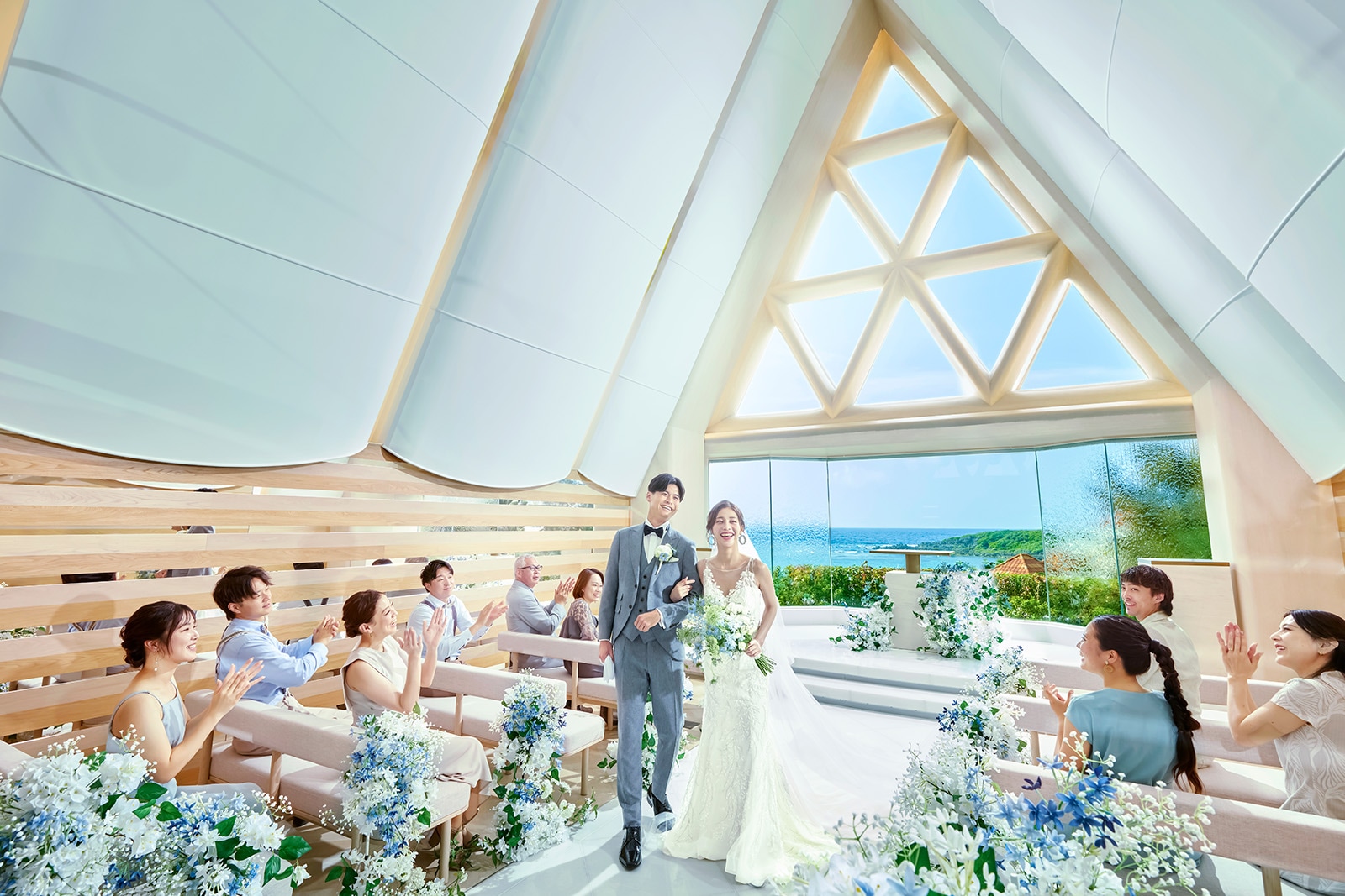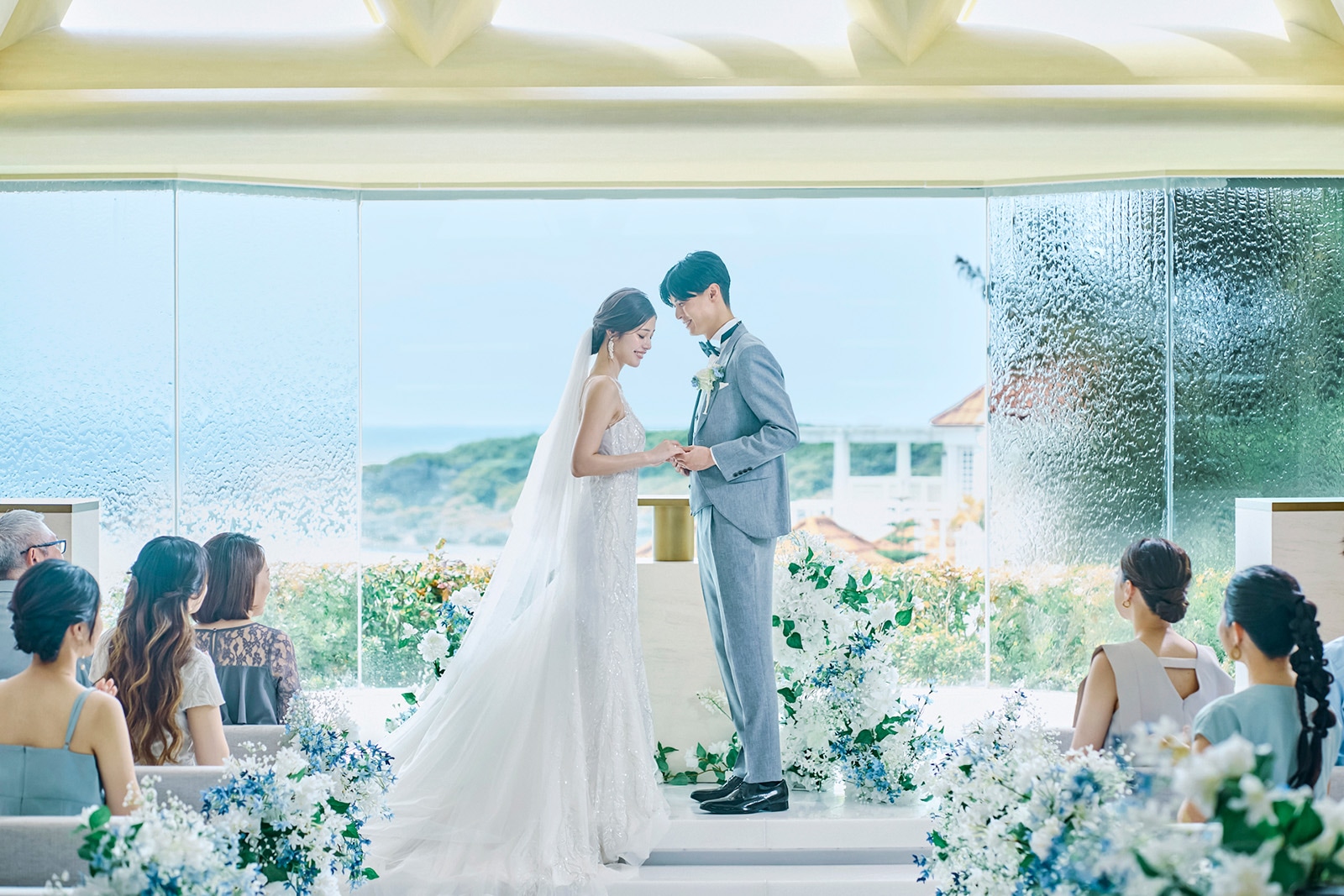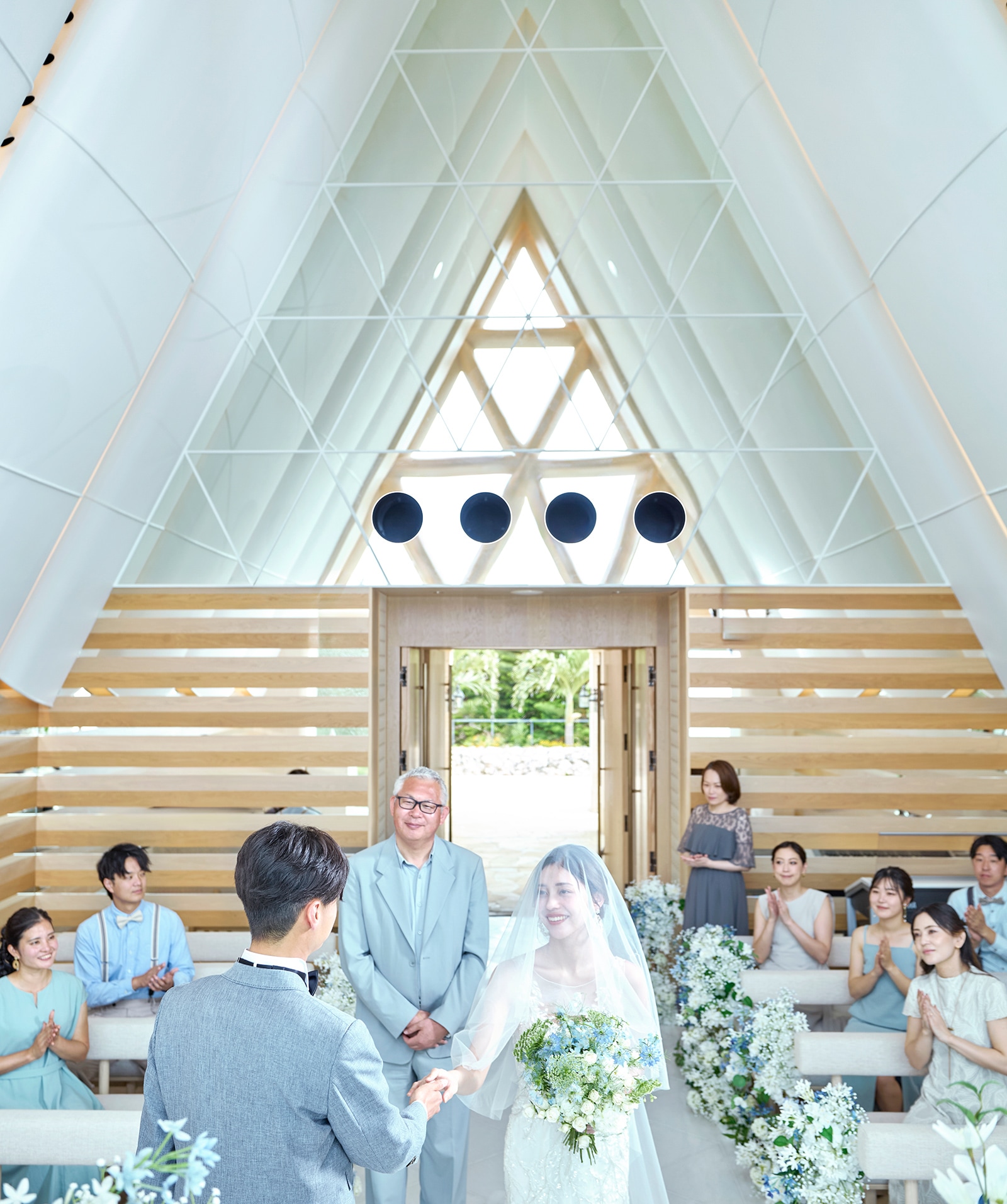 やわらかな自然光が降りそそぐ祭壇で、青い空と海を眺めながら約束を交わす。
