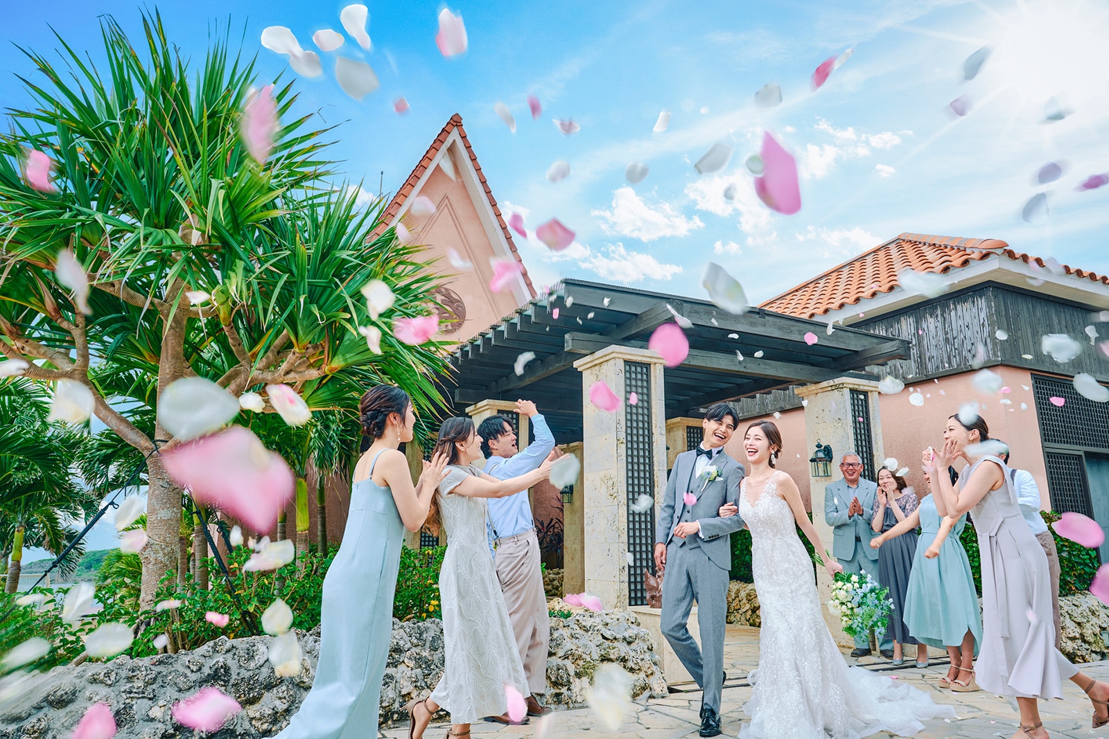 挙式のあとは、宮古島の自然と笑顔に包まれたフラワーシャワーを。