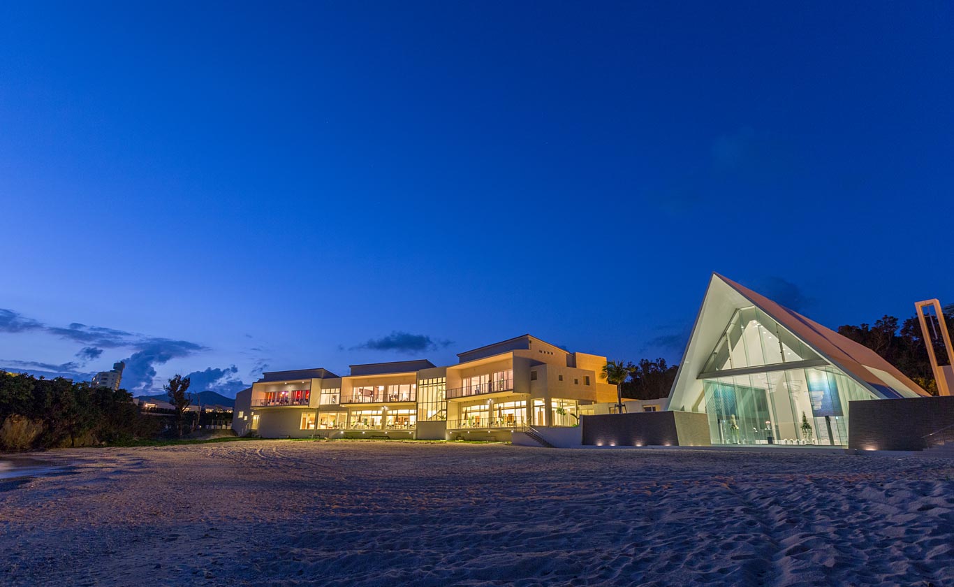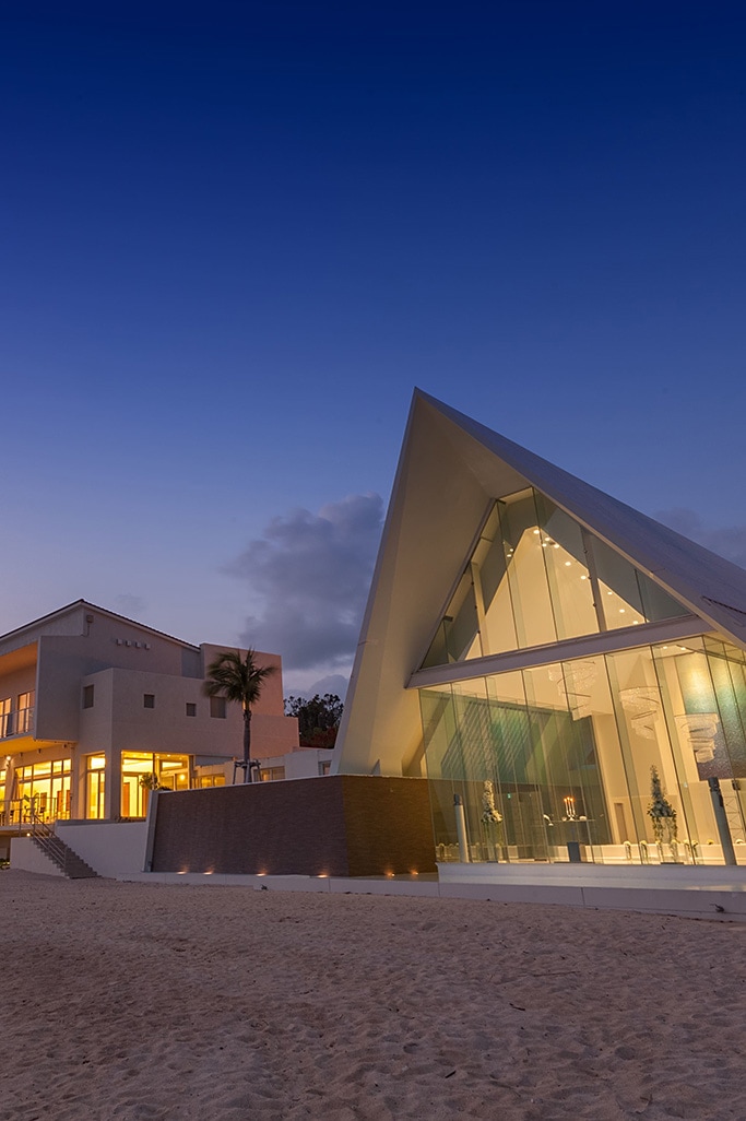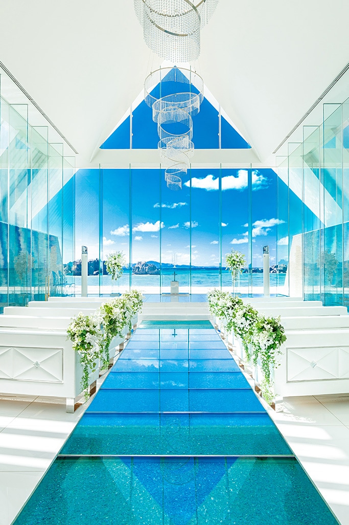 全面ガラス張りのオーシャンフロントチャペル。チャペルの扉を開けた瞬間に視界に飛び込んでくる青い海が広がる景色は、「ふたりの未来」が輝いていることを予感させてくれます。