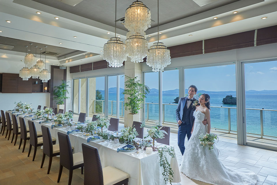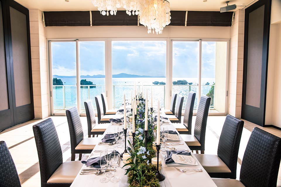 直線を基調としたデザイン性溢れるオーシャンフロントのバンケットは、