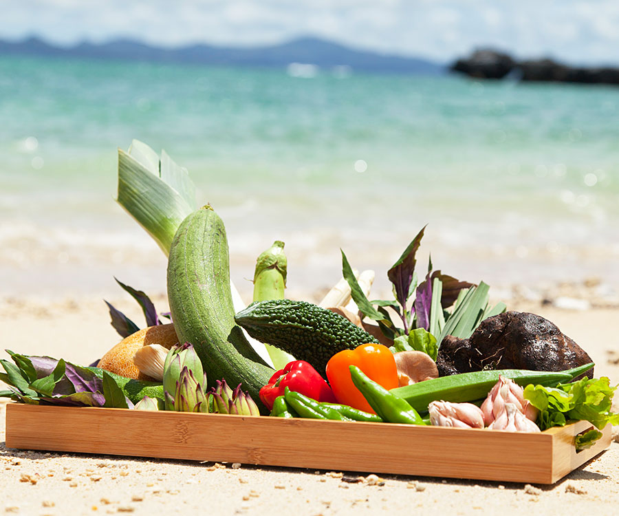 島らっきょうや島にんじん、紅いもなどの沖縄ならではの珍しい野菜類、磯の香り立つあおさ海苔などの海藻類、新鮮な魚介類、沖縄県産の精肉類、太陽の恵みをたっぷりと受けて育った南国フルーツなど、日頃はあまり口にすることのない食材をお子様からご年配の方に至るまで全てのお客様にお喜びいただけるための料理をご提供します。