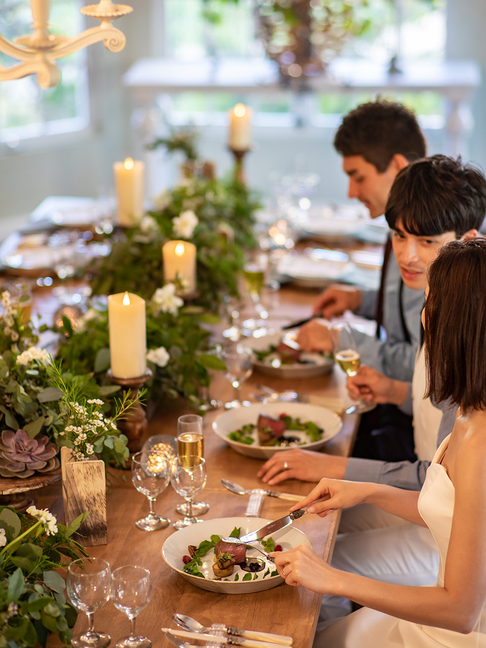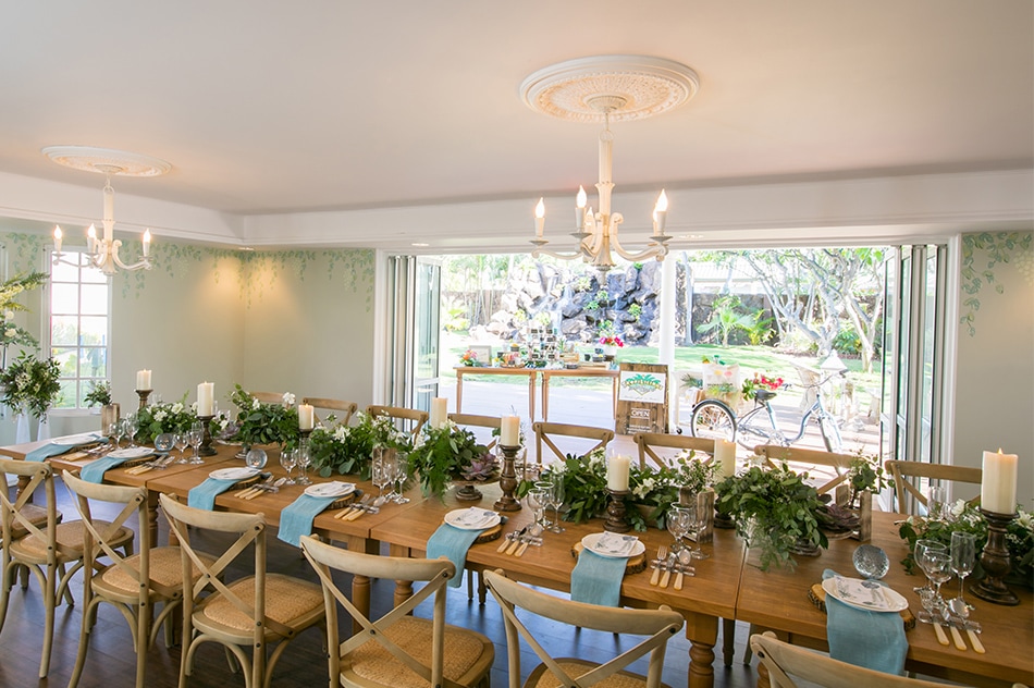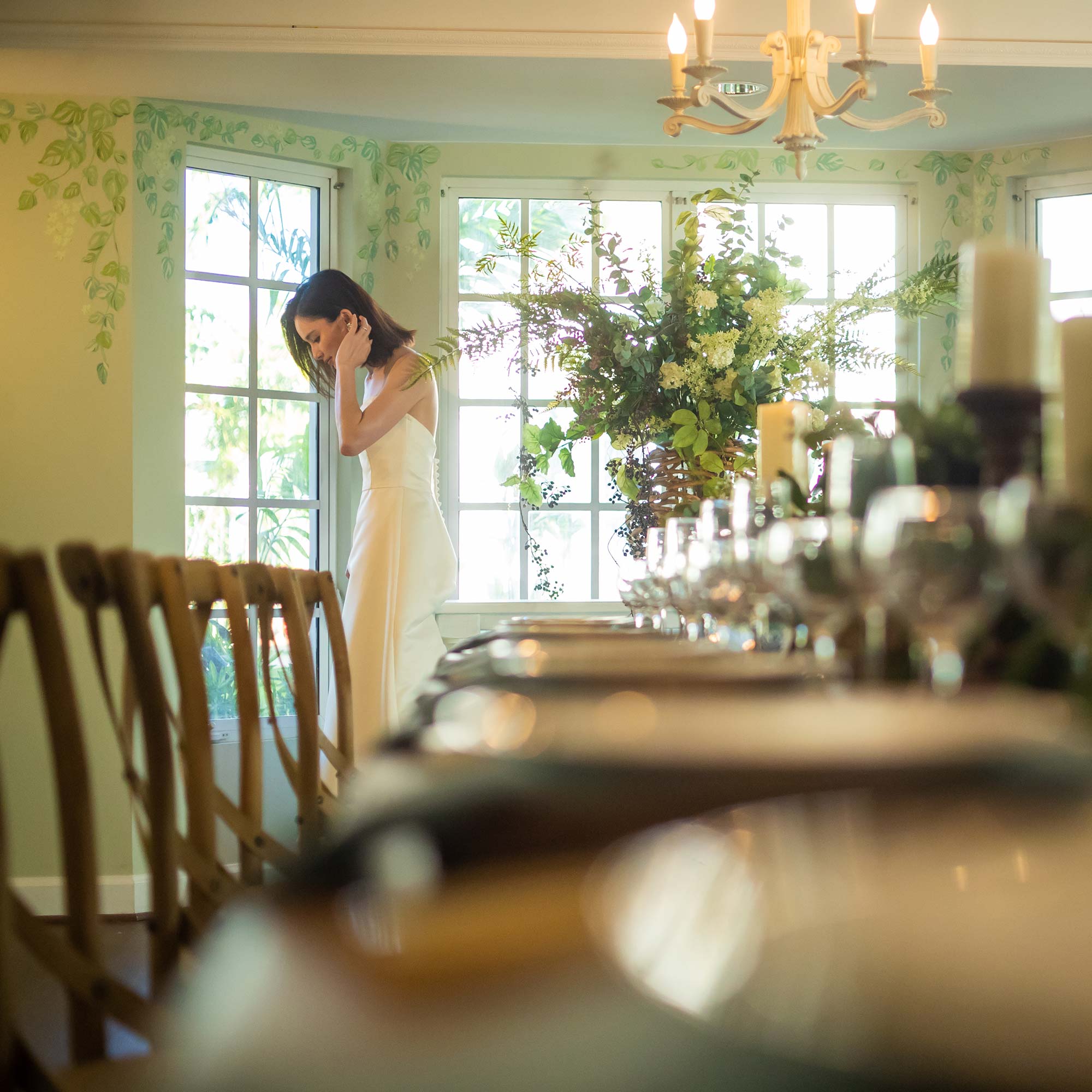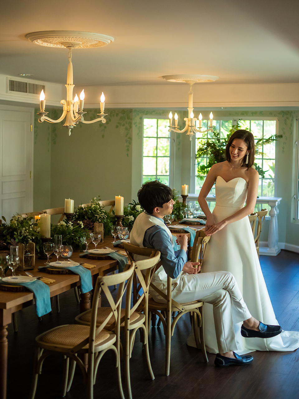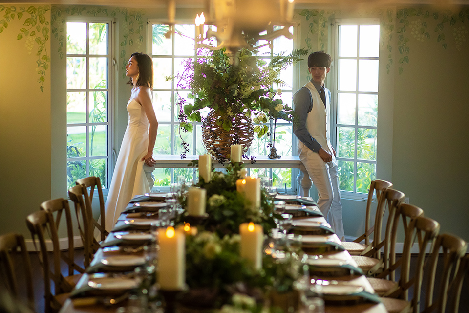 シャビートーンとウッディなテーブルコーディネートで揃えセンスフルな空間に、壁面には庭の自然を映したようなグリーンの装飾を施され、お部屋とテラスが続いて見えるような開放感のあるスペース。