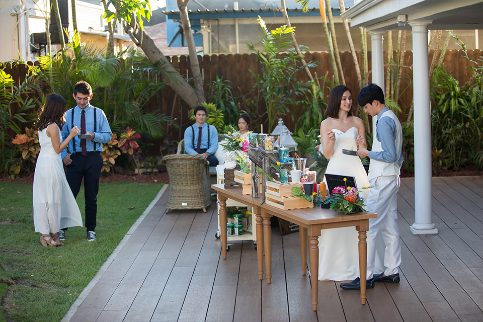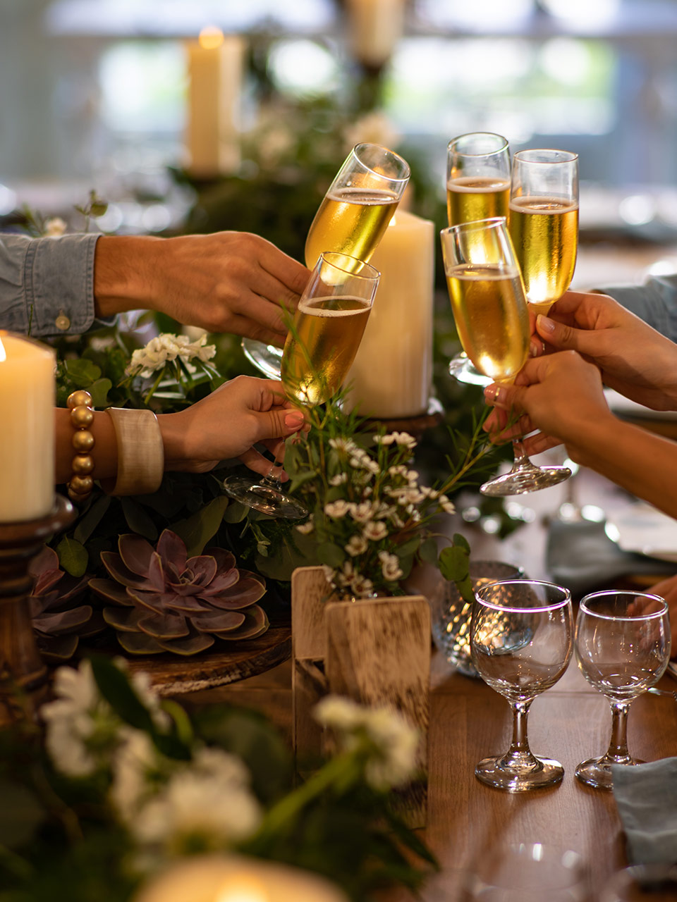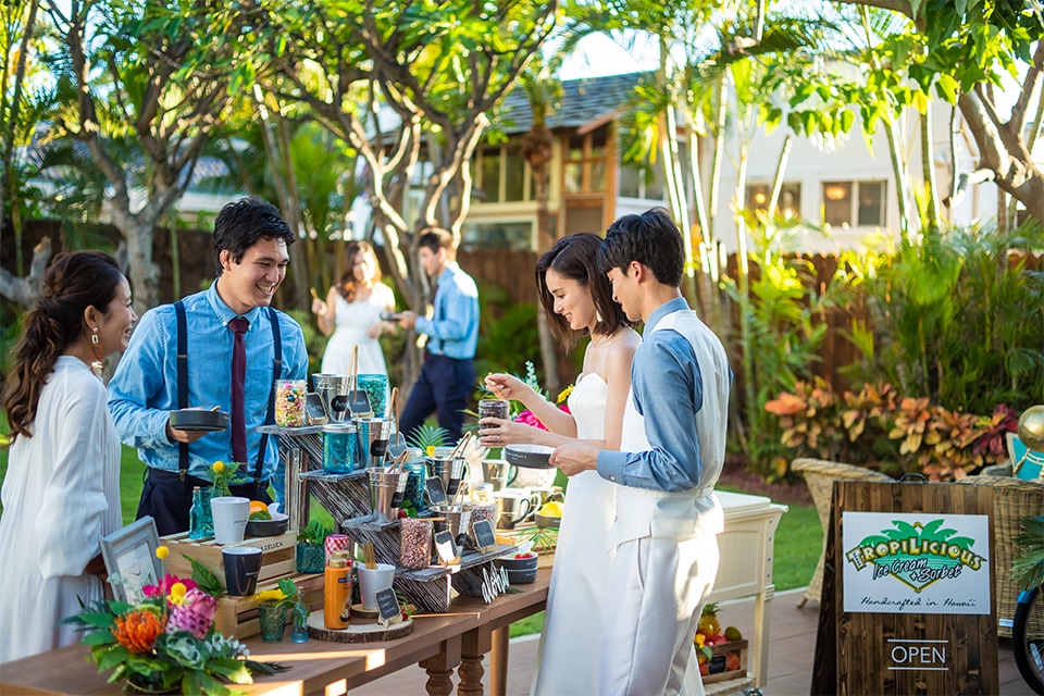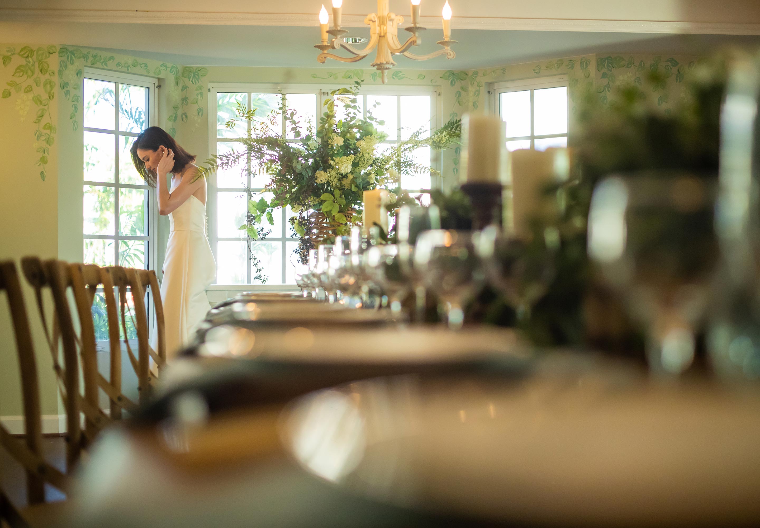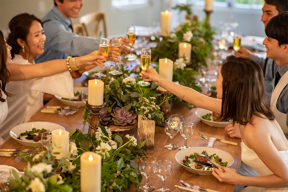 シャビートーンとウッディなテーブルコーディネートで揃えセンスフルな空間に、壁面には庭の自然を映したようなグリーンの装飾を施され、お部屋とテラスが続いて見えるような開放感のあるスペース。