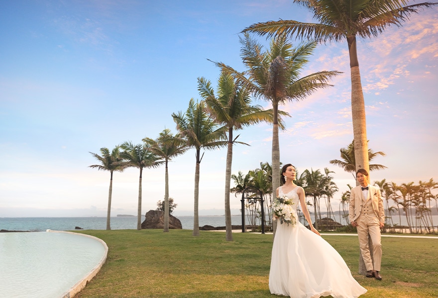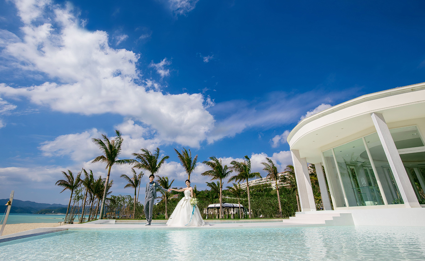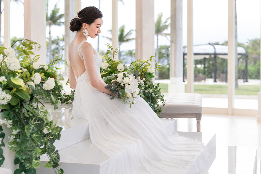 事前に日本国内のクチュールナオコサロンで試着し、衣裳を予約。日本で決めたお気に入りのドレスと同じデザイン、サイズのドレスを海外や沖縄などのリゾート地でご利用いただけます。