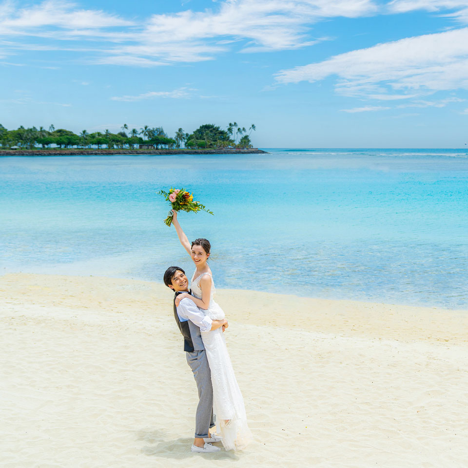 ハワイならではの最高のロケーション!白い砂浜とキラキラ輝く青い海を背にビーチフォトを撮影できます。