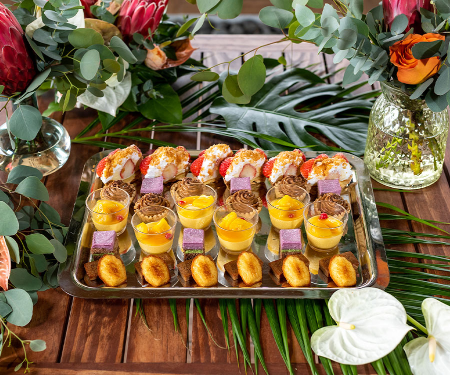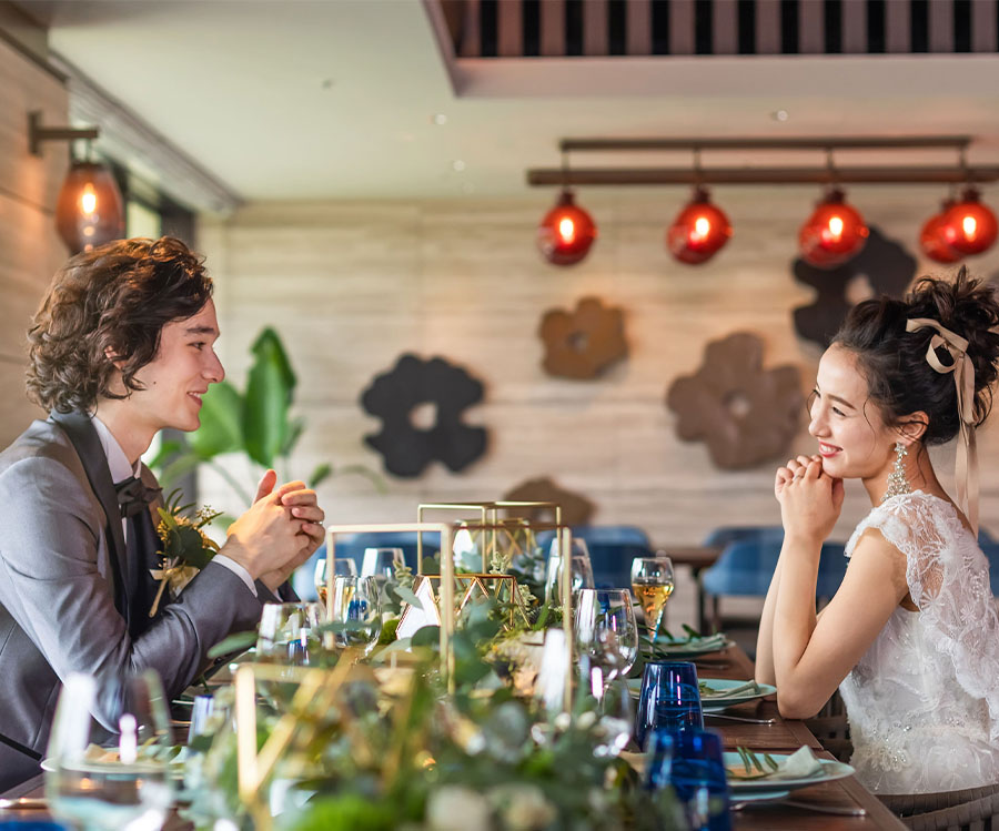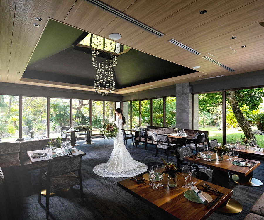挙式と、石垣島の夜空を思わせるシャンデリアと全面ガラスを通して、琉球庭園を望む特別感あふれる空間“HANARÉ”でのパーティー、大切な人たちとゆっくり楽しい時間を過ごせる少人数でのウエディングパーティープラン。