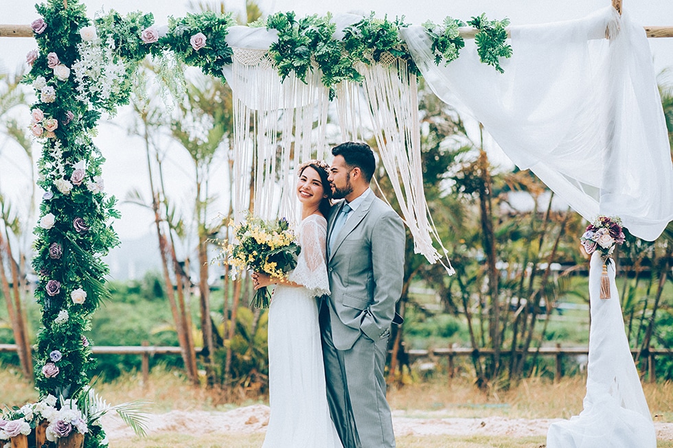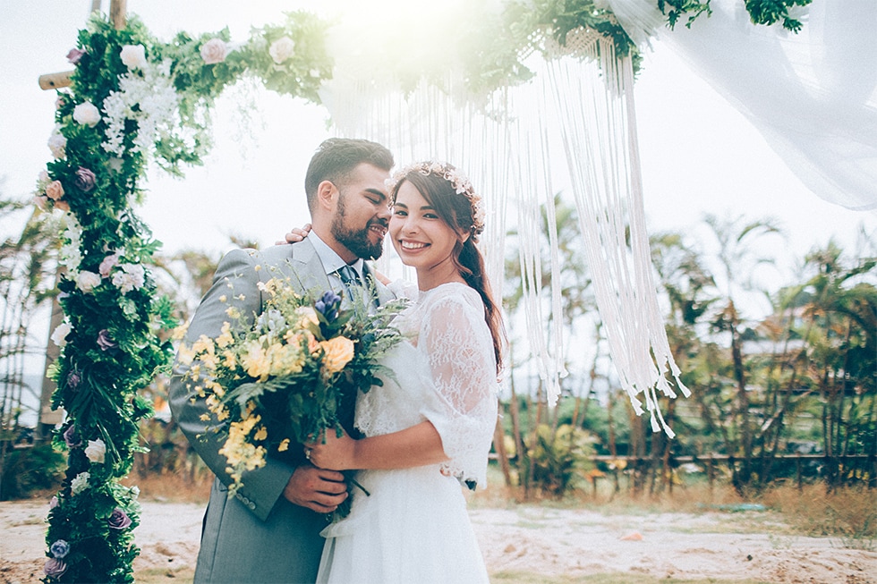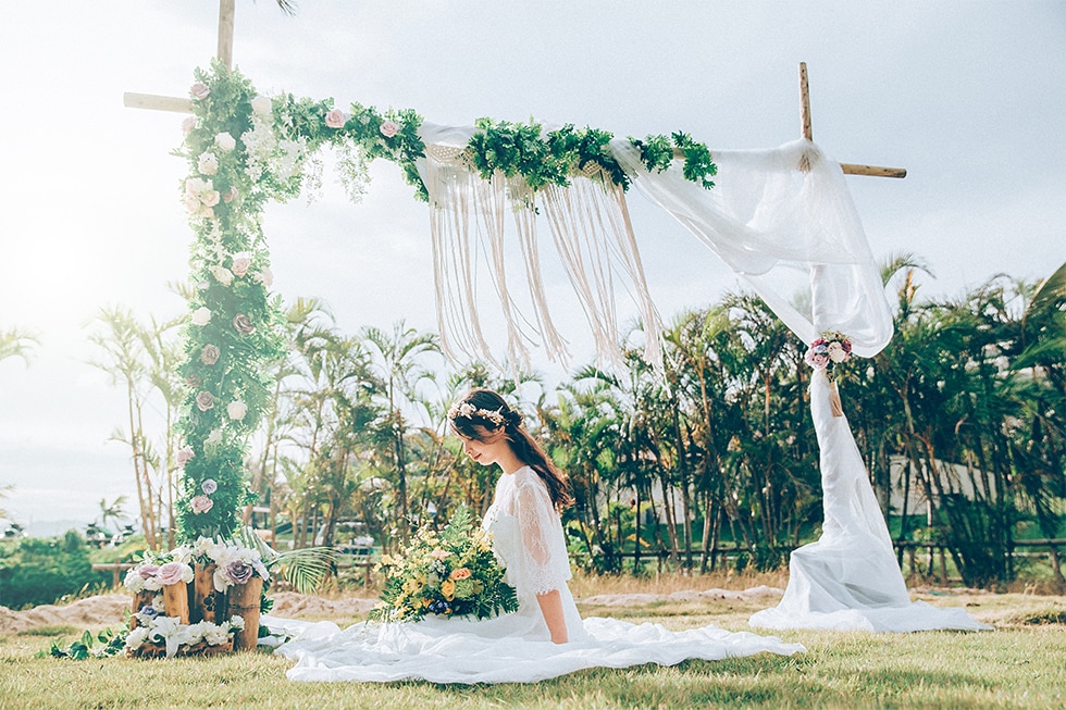 トレンドのボーホーウェディングの要素を取り入れたアーチでフォトシューティング。