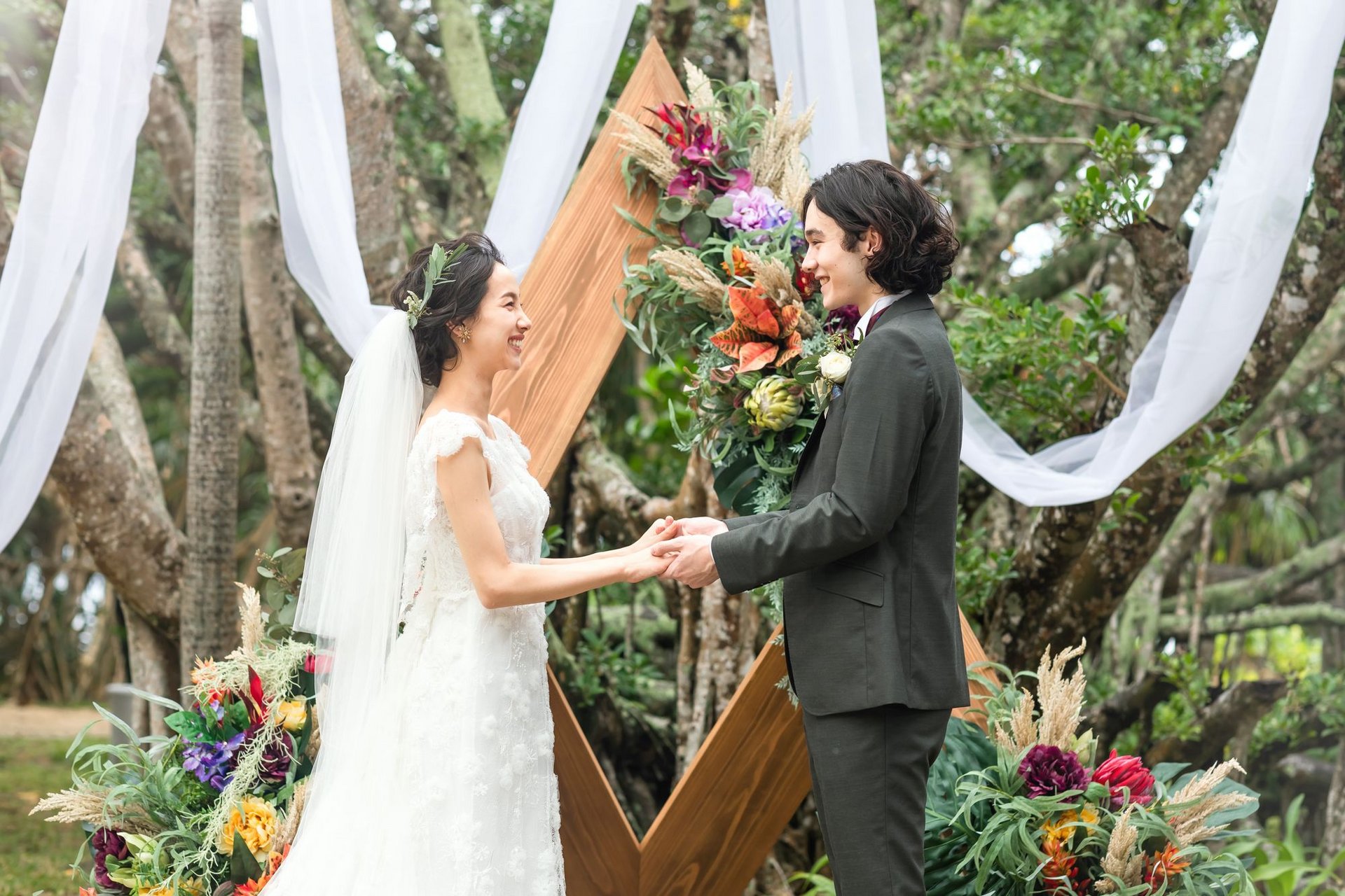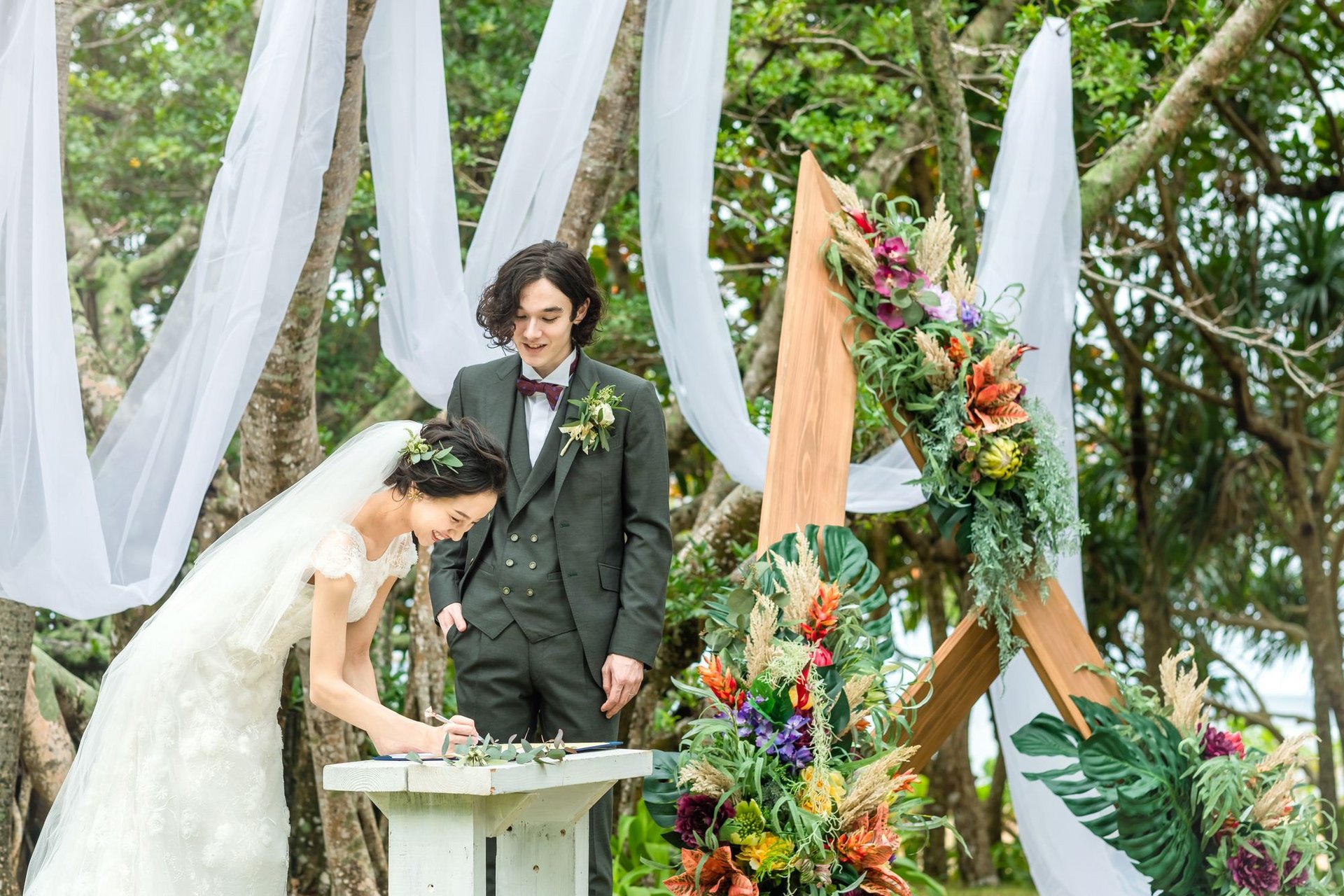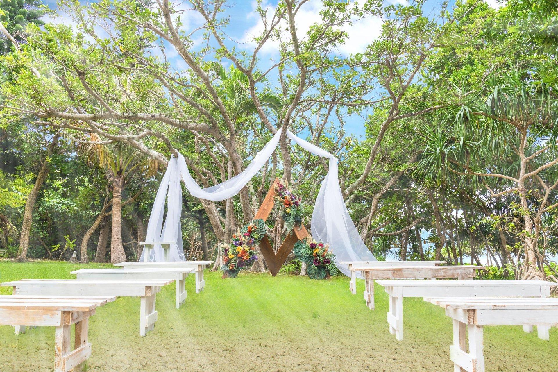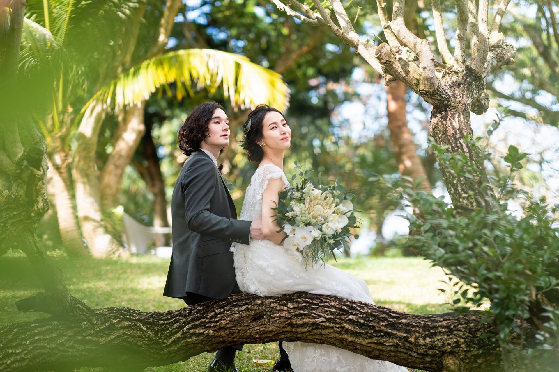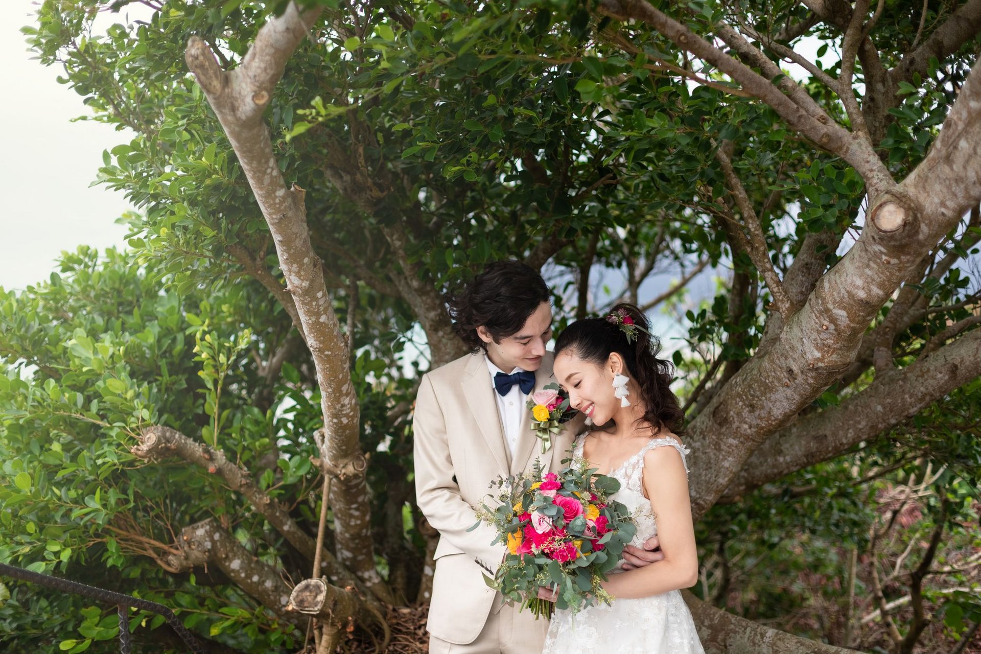 石 垣 島 の 爽 や か な 風 を 感 じ な が ら 、大 自 然 の エ ネ ル ギ ー や パ ワ ー が 宿 る 樹 木 に 見 守 ら れ 愛 を 誓 う