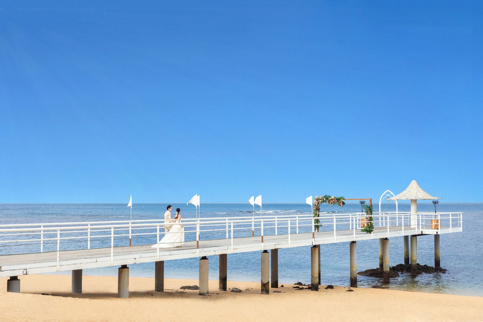 美しい海へと続く桟橋「エンジェル ピア」での挙式は、360°C海に囲まれ、まるで海の上に立っているかのような贅沢なロケーション