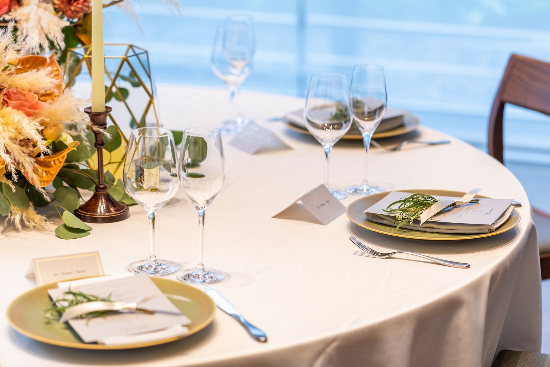 壁 一 面 に 広 が る 窓 か ら自 然 光 が 降り注ぐ 、 開 放 感 た っ ぷりの 会 場 で 祝 宴 を 。