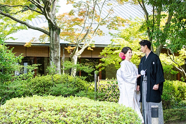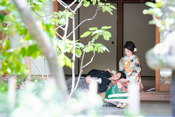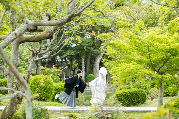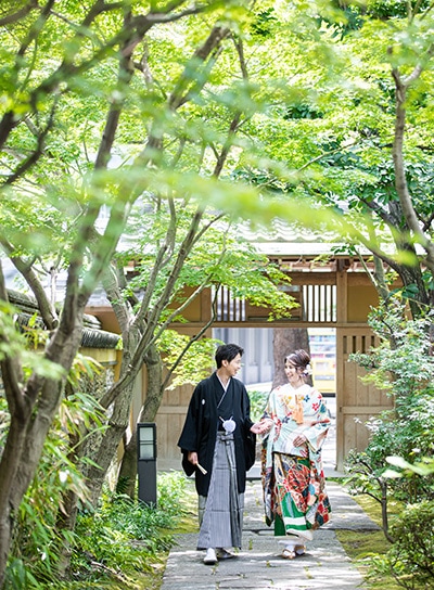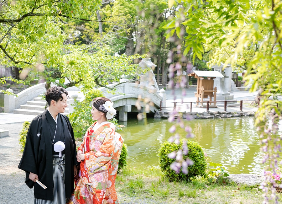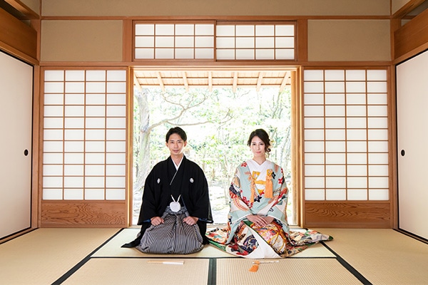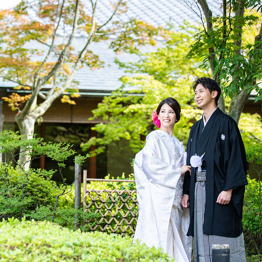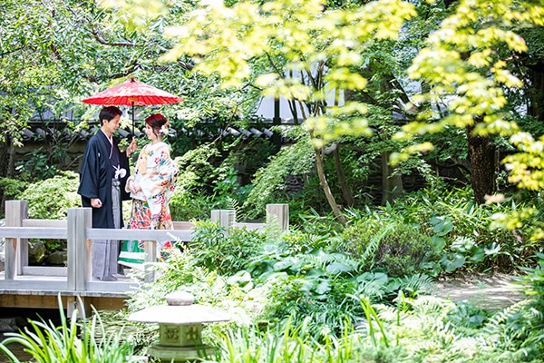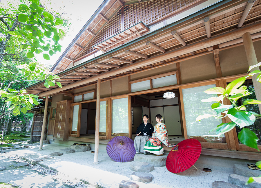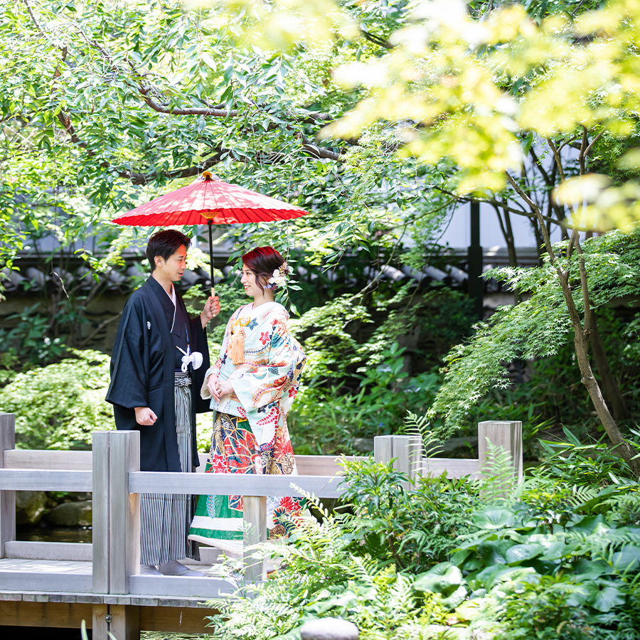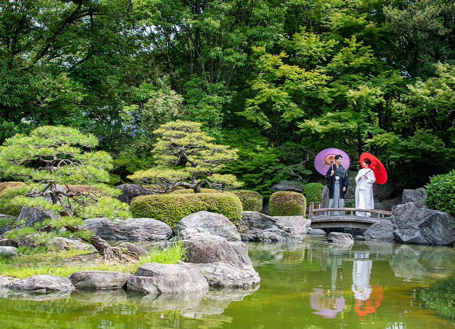 博多駅近く、オフィス街にたたずむ由緒正しき日本庭園。美しく整えられた庭園を臨みながら、茶室で落ち着いた和装撮影を行うことができます。