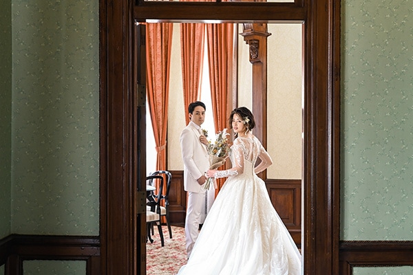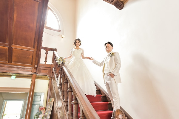 天神中央公園の一角に佇むクラシカルな洋館。国の重要文化財にも指定された歴史的建造物で、明治時代の古きよきロマンあふれる撮影を行うことができます。