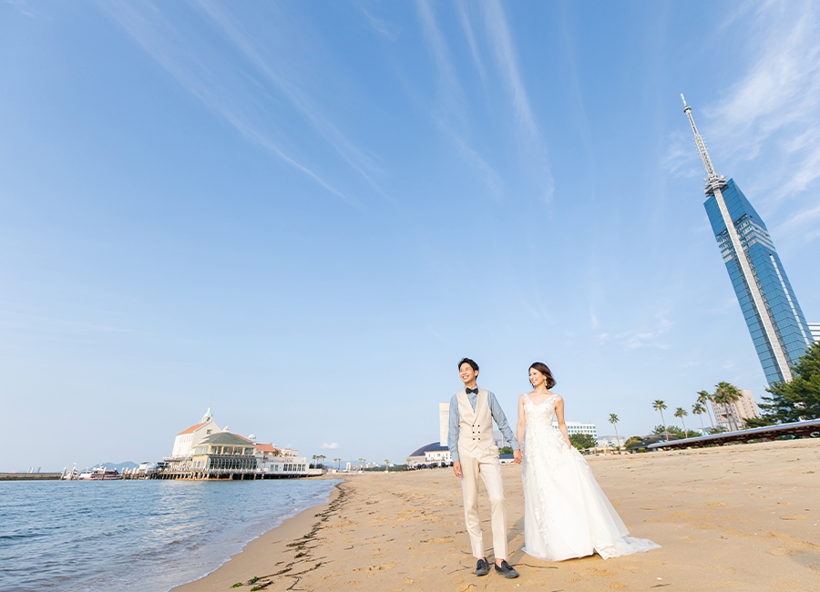 福岡タワーの北側に広がる、都市部にほど近い海浜公園。福岡市内でビーチフォトをご希望の方におすすめです。