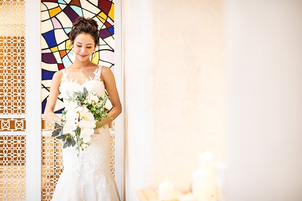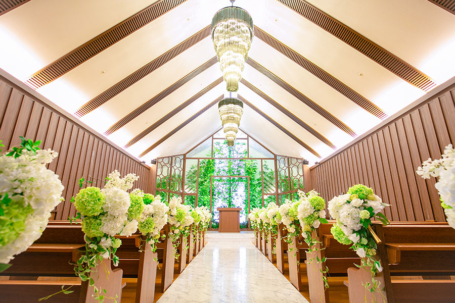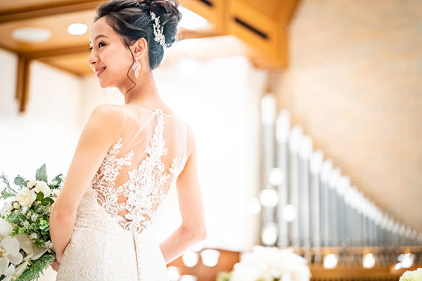 栄駅から徒歩5分のホテル名古屋ガーデンパレス内のアットホームなチャペル。木目調の温かみのある造り、本格的なパイプオルガン、白大理石のバージンロードで挙式さながらの撮影を。