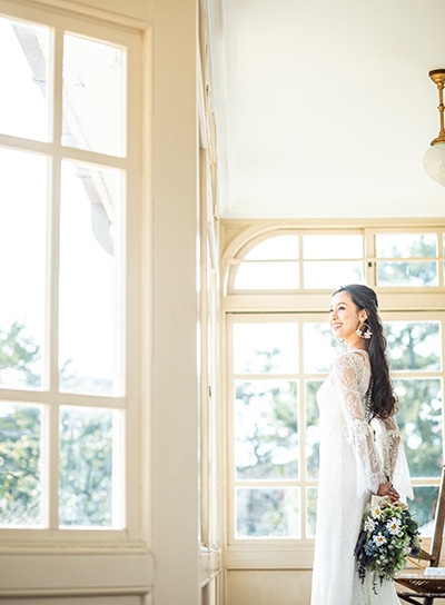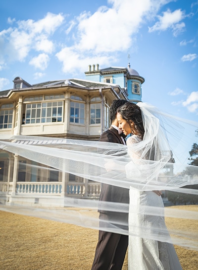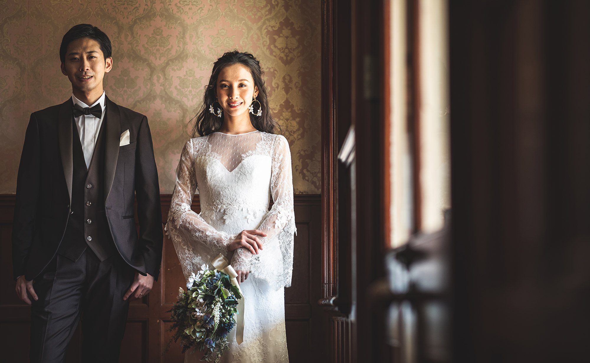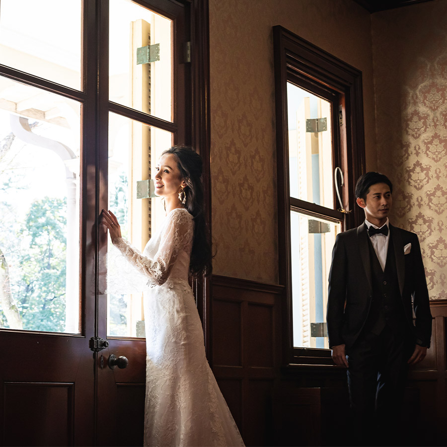 19世紀ヨーロッパの建築技術で建てられた、映画のロケ地としても有名な名古屋市の重要文化財。大理石造りの大階段ではドレスが際立ち、クラシカルで重厚感あるお写真に仕上がります。