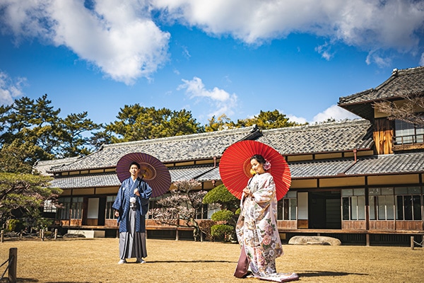 三重県桑名市にある旧二代目諸戸清六の邸宅。広大な敷地には洋館と和館、日本庭園があり、洋装・和装どちらも素敵に撮影できます。