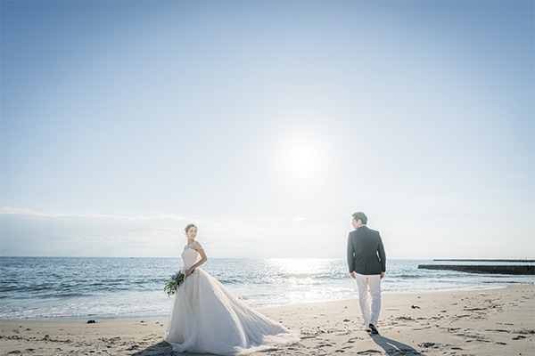 名古屋市からアクセスも良いりんくうビーチでは、白浜の上でまるでリゾートのような撮影ができます。