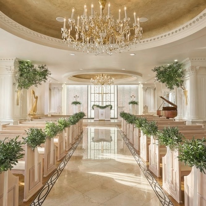 大きなシャンデリアと大理石のヴァージンロードが神聖な館内チャペル。
