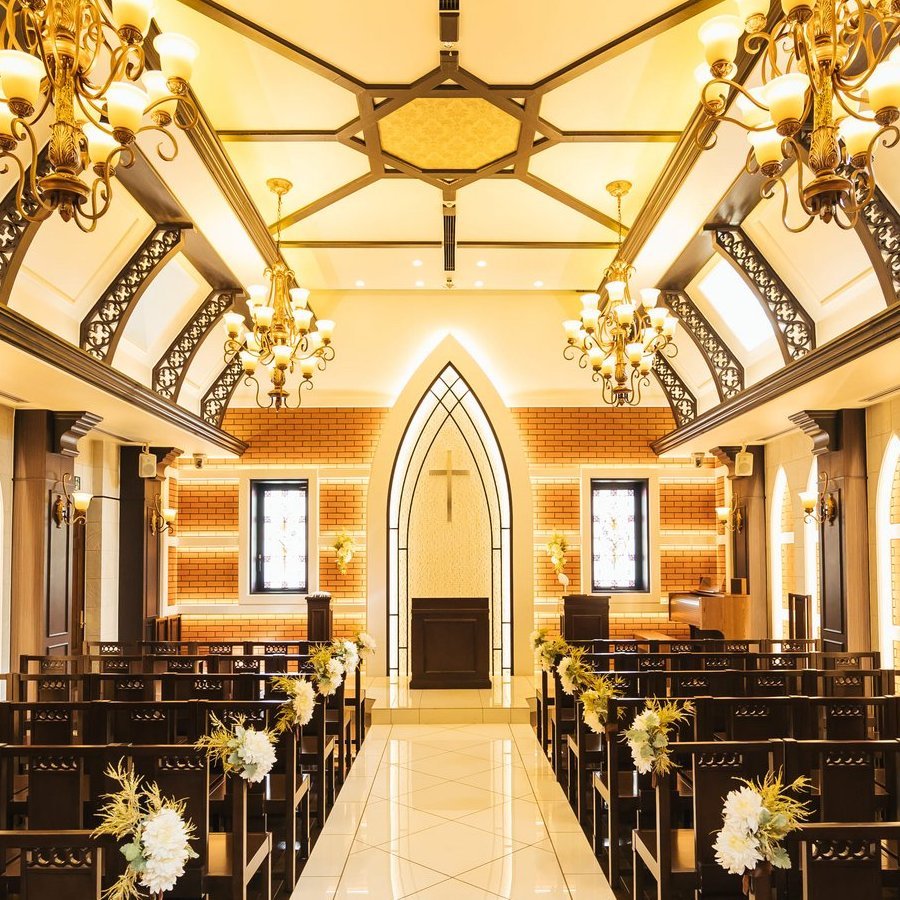 中世ヨーロッパを感じさせるクラシカルなチャペル。落ち着いたレンガの壁、太陽と海をモチーフにしたステンドグラス、大理石製の純白のバージンロード、色調を抑えたダークグレーの床面とのコントラストが洗練された印象を醸し出し、まさに「優雅」という名にふさわしい空間が広がります。