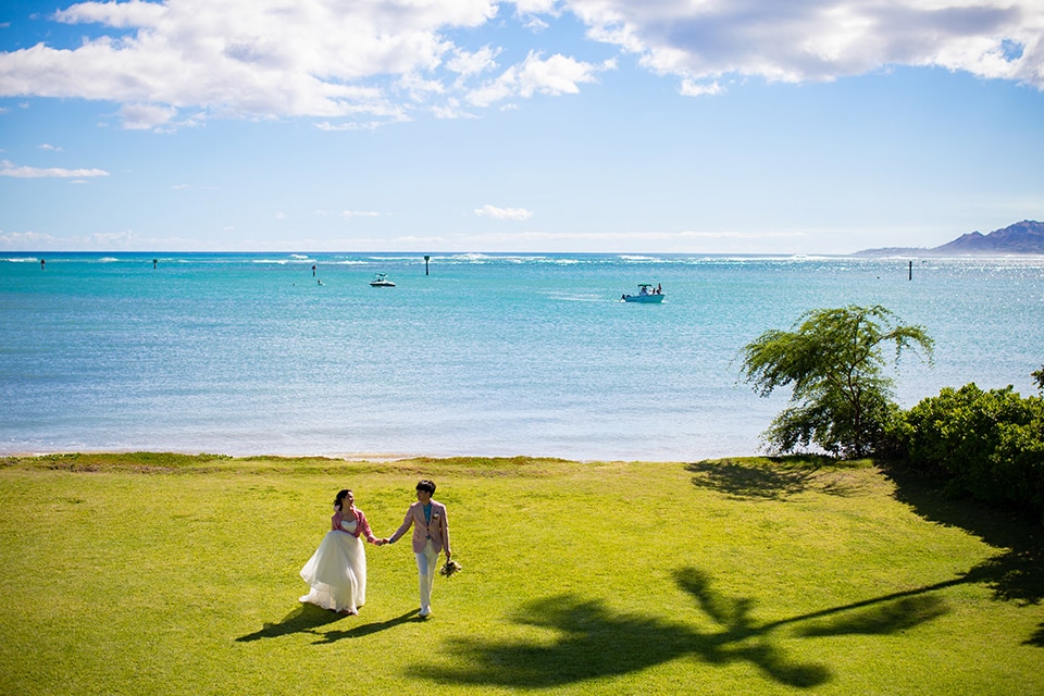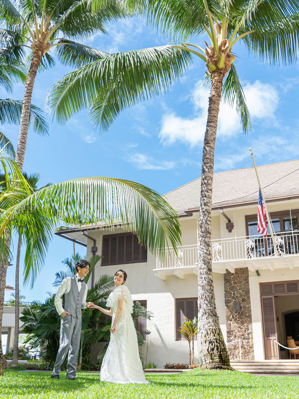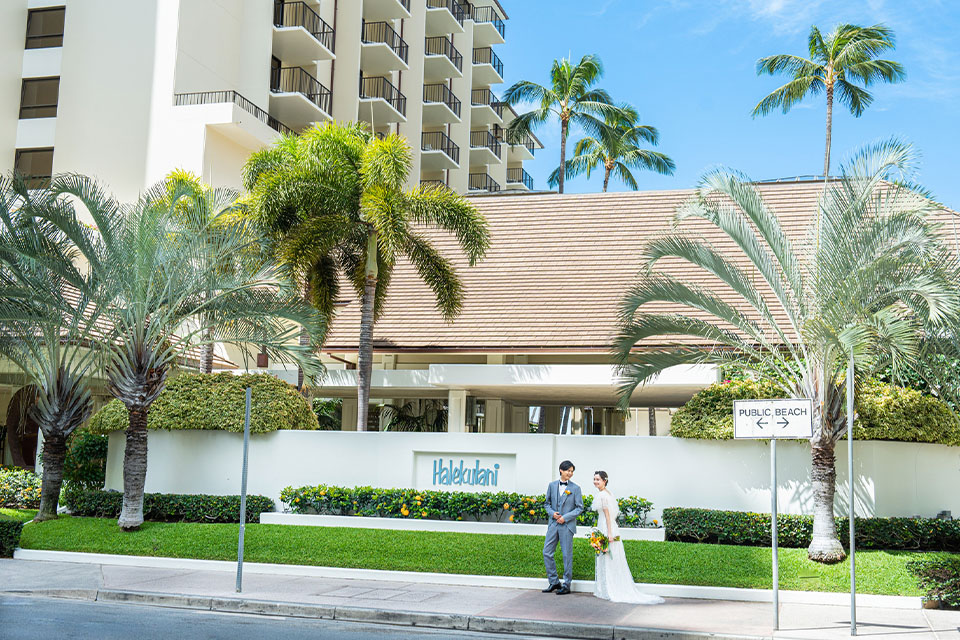 ハワイには絵になるロケーションのホテルがたくさん。そんなホテルでおしゃれな撮影を。ハワイ語で「天国にふさわしい館」と称されハワイを代表する「ハレクラニ」で。